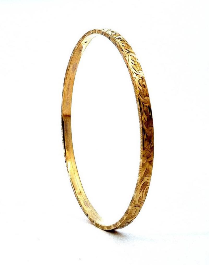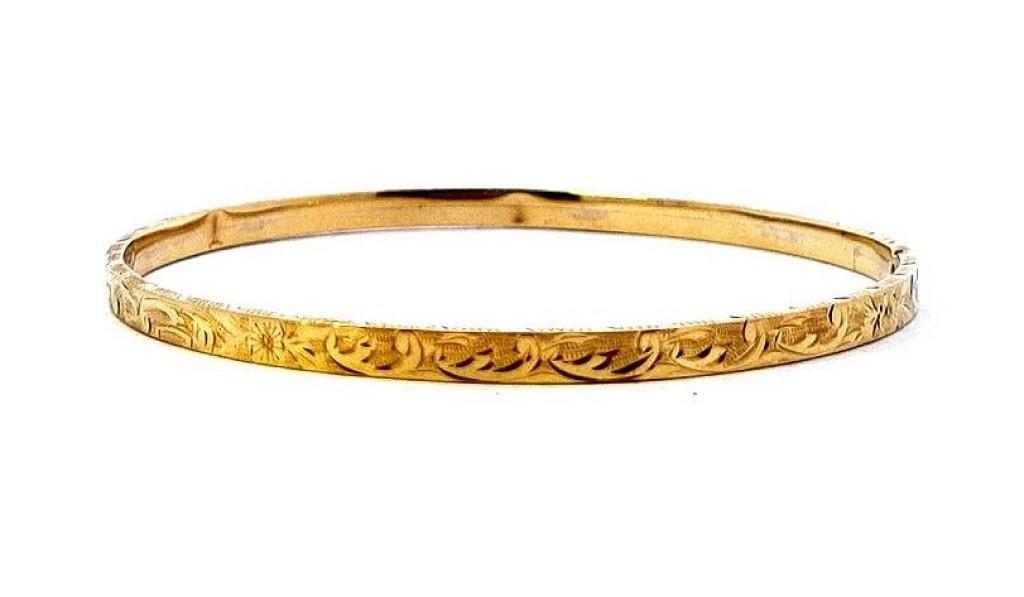 Zlatý náramek o ryzosti 585/1000 s puncem labutě. Váha 6,04 g, vnitřní průměr 67 mm, šířka 4 mm.