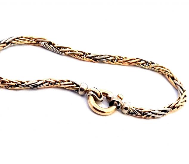 Náramek z kombinace žlutého a bílého zlata o ryzosti 585/1000, punc labuť. Váha 6,83 g, délka 19 cm, v nejširším bodě 4 mm.