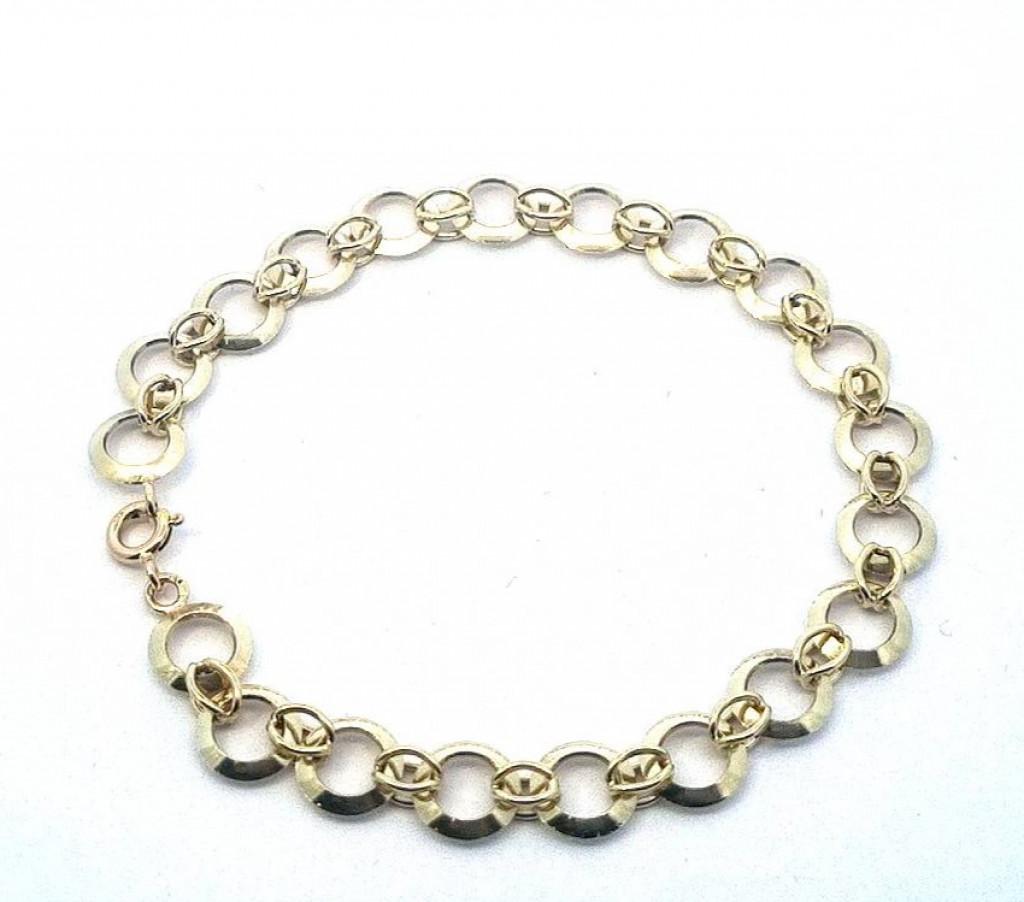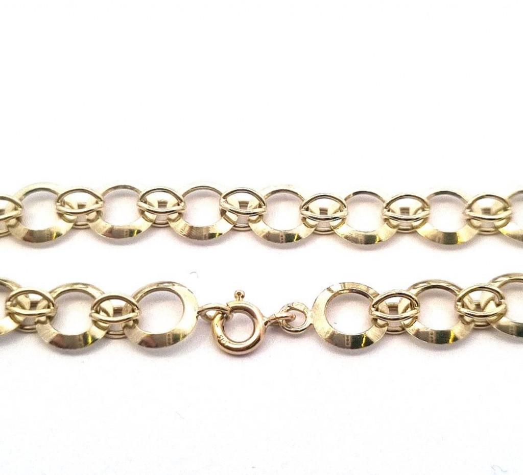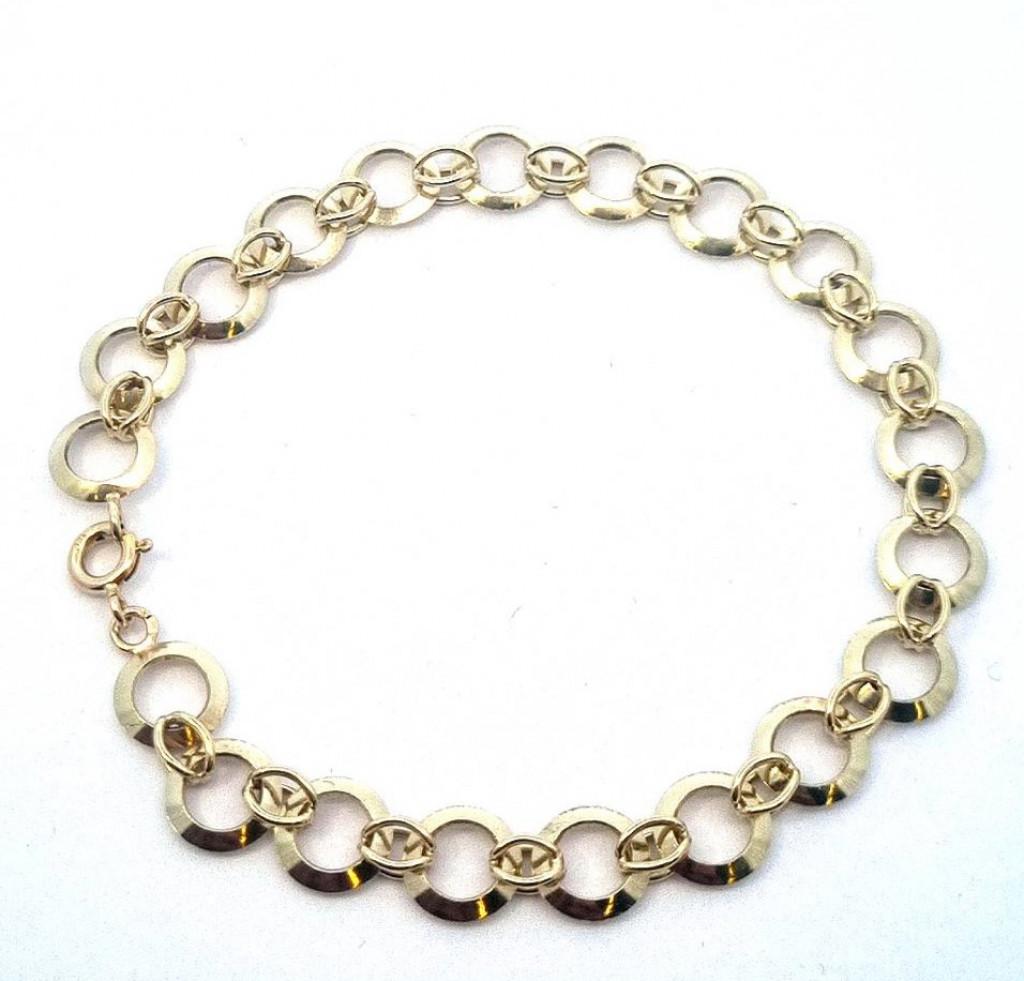 Zlatý náramek, žluté zlato, váha 8,10 g, ryzost 585/1000, punc labuť. Délka 19 cm, průměr kroužků vnější je 8 mm.
