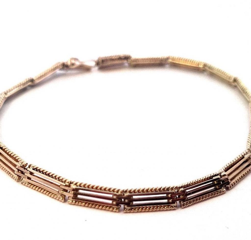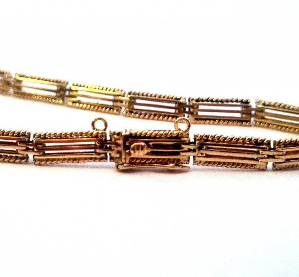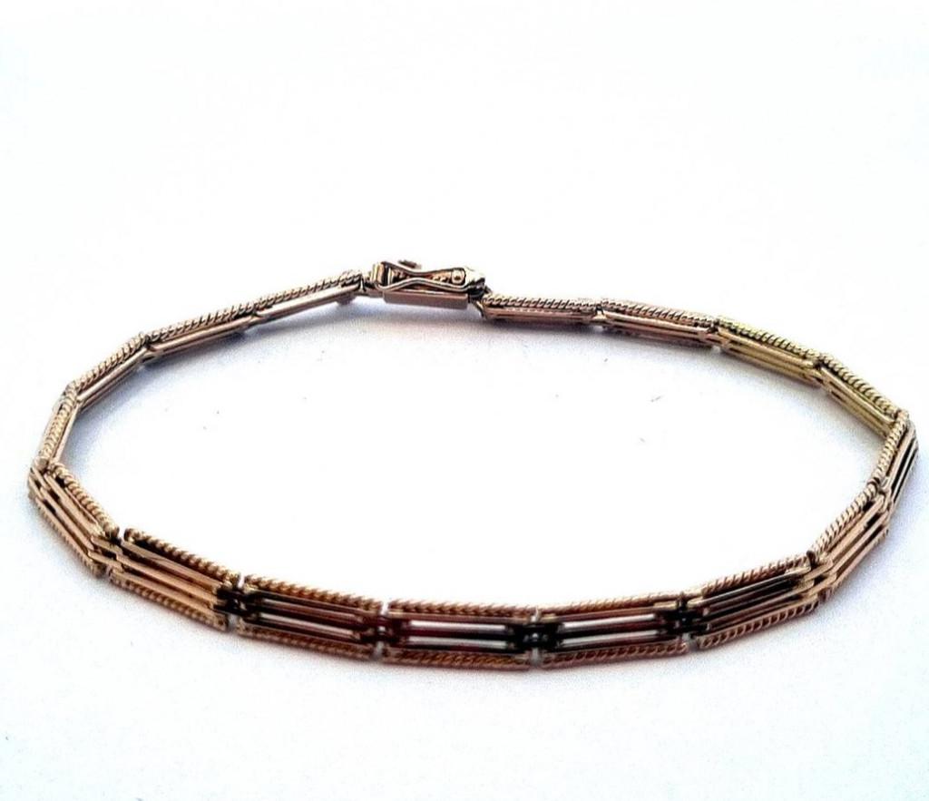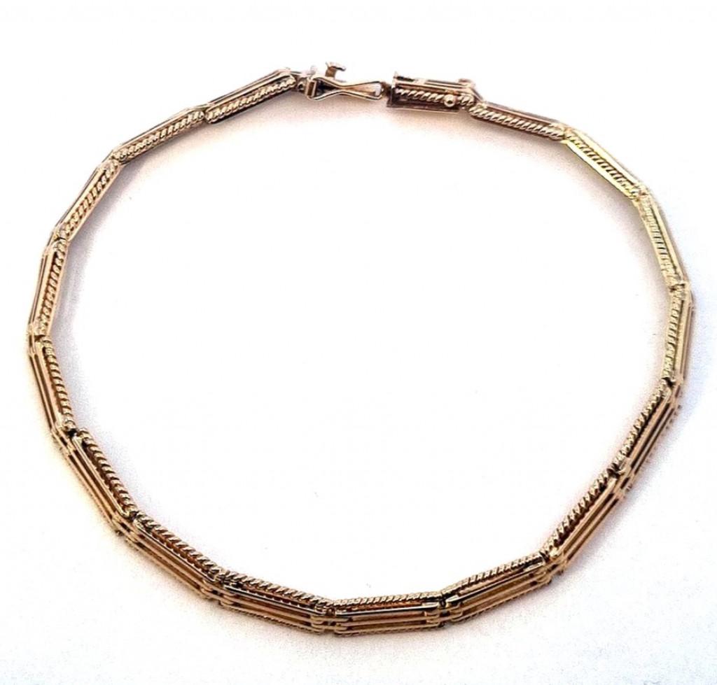 Zlatý náramek o ryzosti 585/1000, platná puncovní značka - čejka, váha 8,98 g, délka 19 cm. Pojistný řetízek byl původním majitelem odstraněn.
