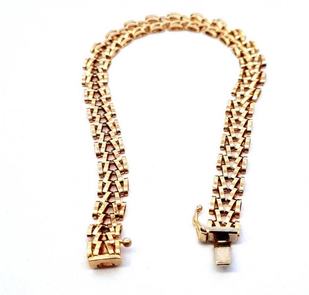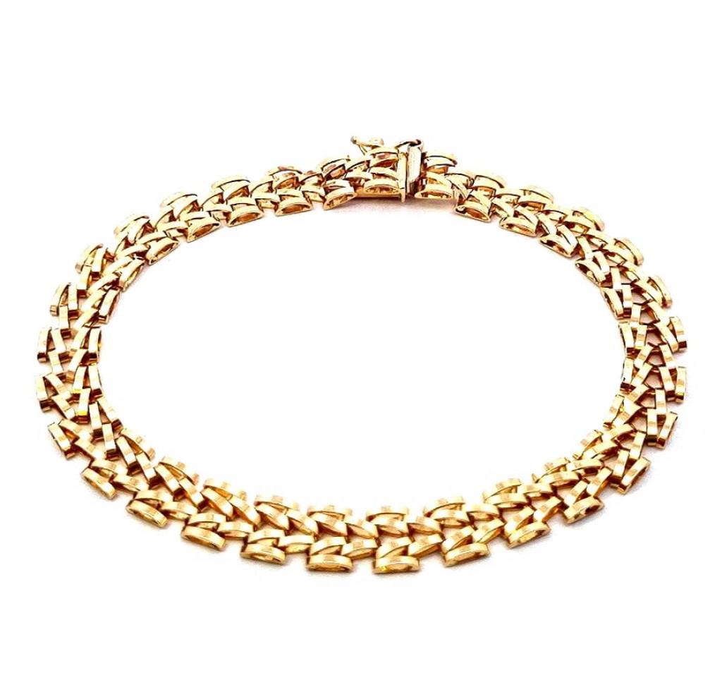 Zlatý náramek o ryzosti 585/1000, punc labuť. Váha 9,16 g, délka 19,3 cm, v nejširším bodě 7 mm.