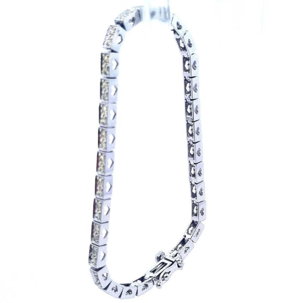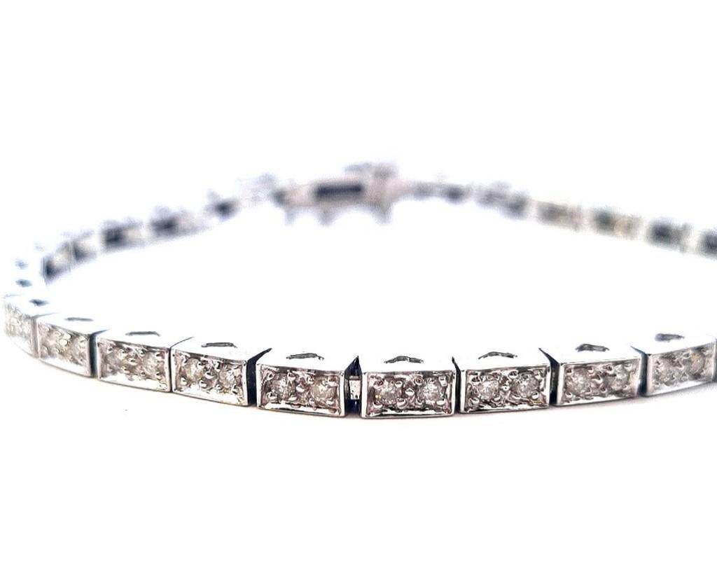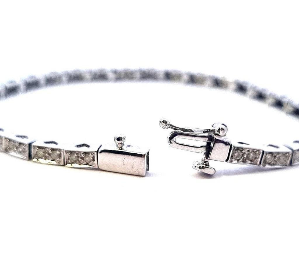 Zlatý náramek o ryzosti 585/1000, punc labť. Váha 12,20 g, délka 19 cm, šířka 3 mm. Kámen - přírodní diamant briliantového brusu - celkem 58 ks, cca 0,04 ct každý - dohromady cca 2,32 ct.