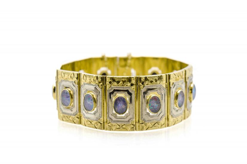 Zlatý náramek s přírodními opály o ryzosti 585/1000, punc labuť. Váha 44,27 g, délka cca 18 cm, šířka 24 mm. Kameny jsou přírodní opály viz. posudek.