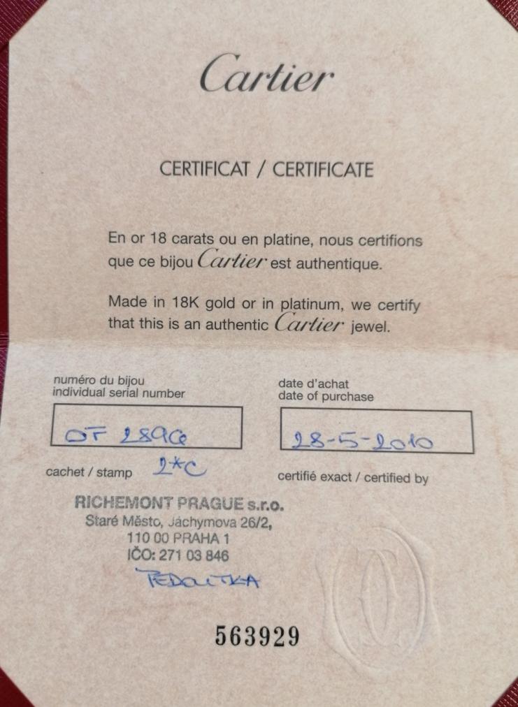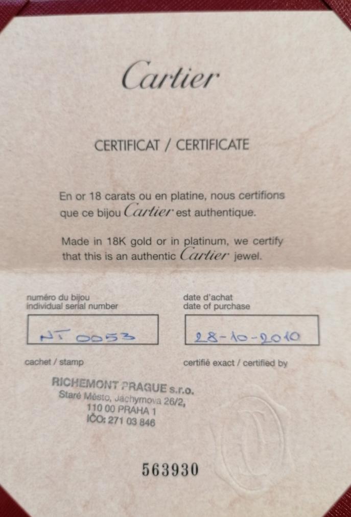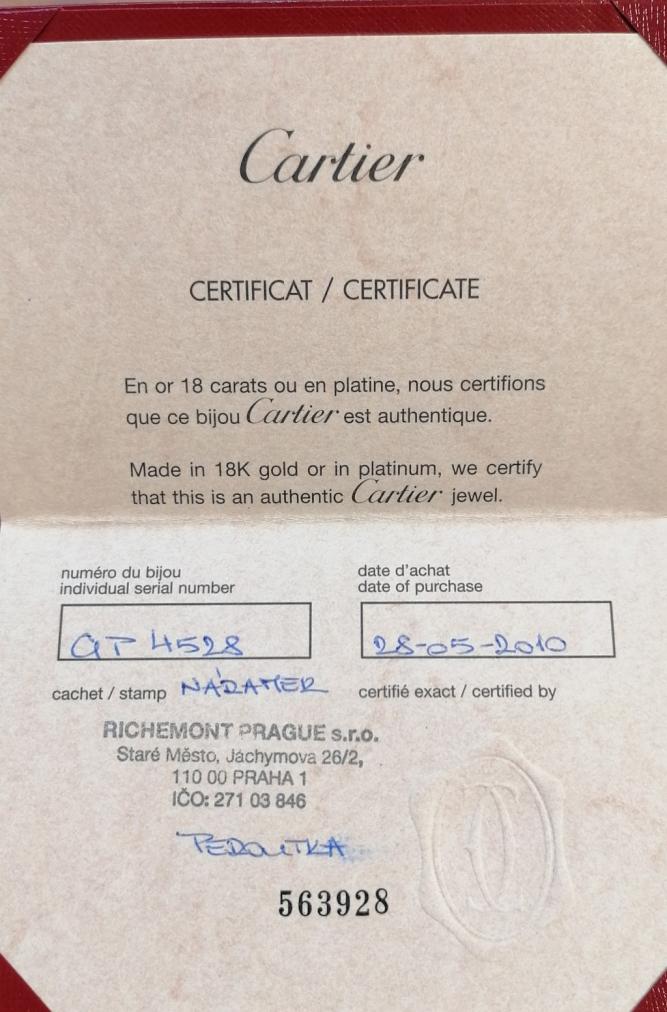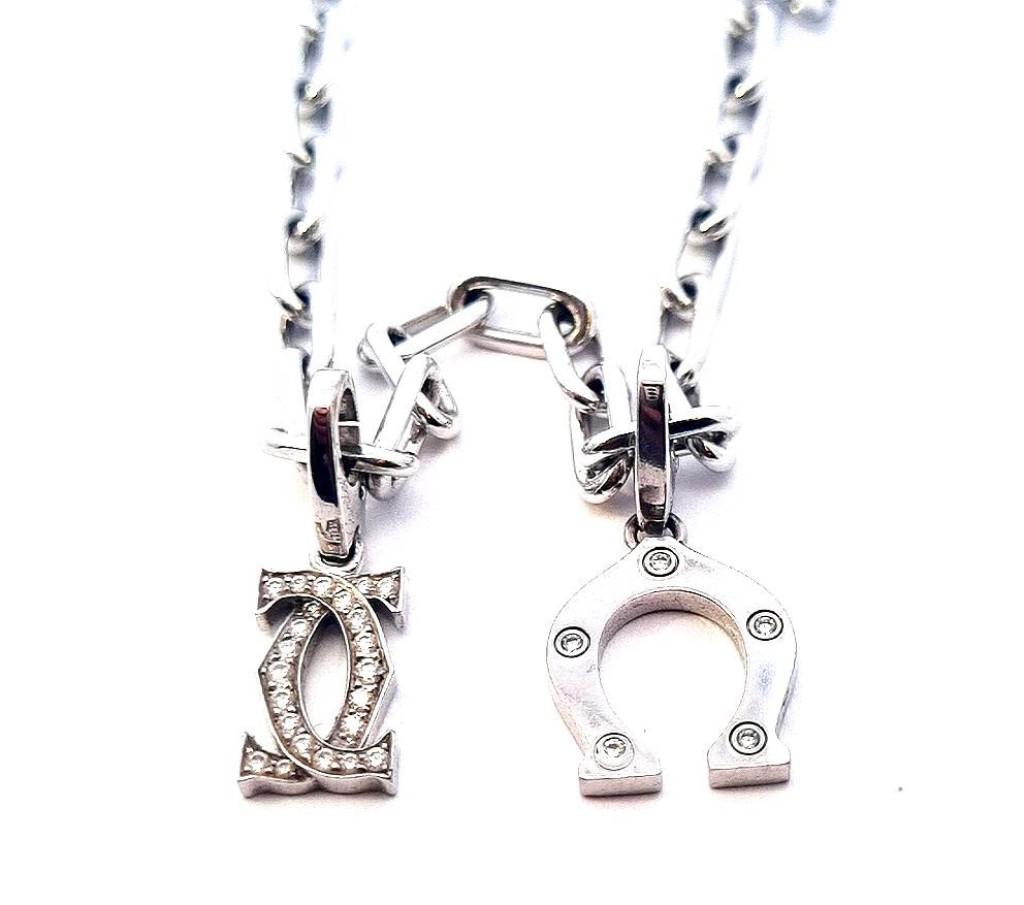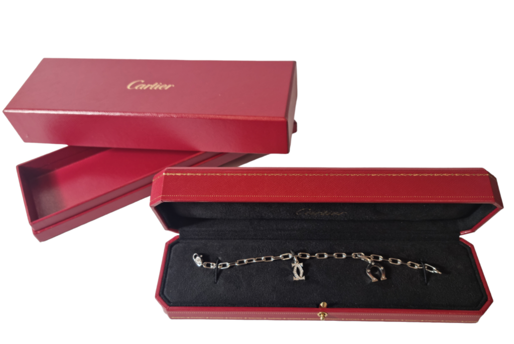 Zlatý náramek, originál značky Cartier, z bílého zlata o ryzosti 750/1000, platná konvenční značka. Přívěsy z bílého zlata o ryzosti 750/1000, platná konvenční značka. Délka 18,6 cm, celková hmotnost 20,10 g, šířka náramku 5 mm. Přívěs podkova: kámen - přírodní diamant briliantového brusu - celkem 5 ks, každý cca 0,01 ct. Přívěs značka Cartier: kámen - přírodní diamant briliantového brusu - celkem 24 ks, cca 0,01 ct každý. Dohromady cca 0,29 ct.