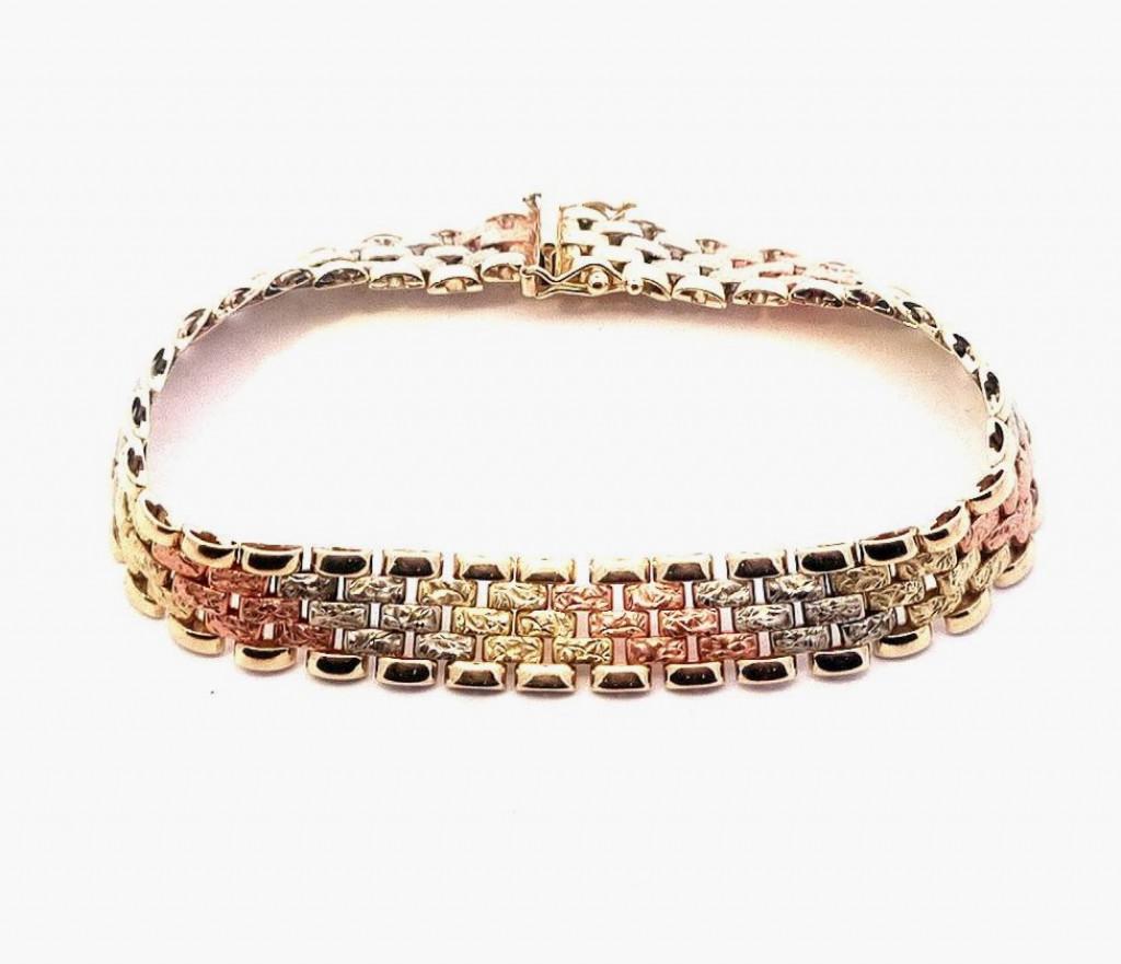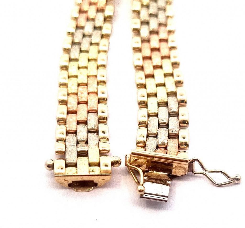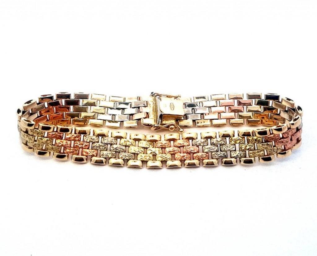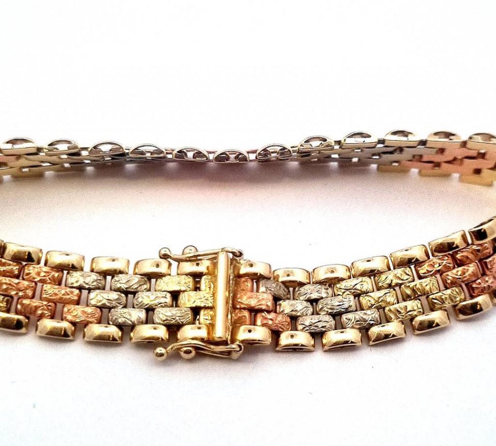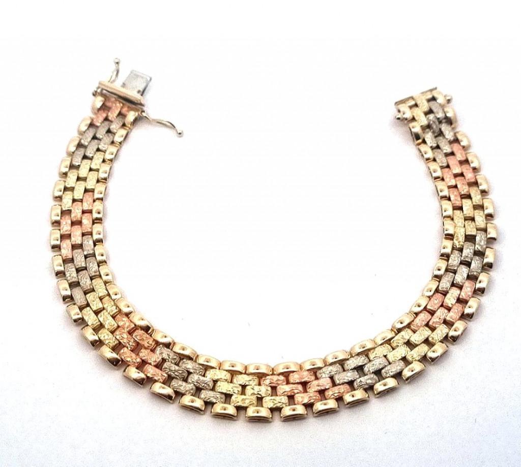 Zlatý náramek o ryzosti 585/1000, platná puncovní značka - labuť, váha 16,71 g, délka 18,5 cm.