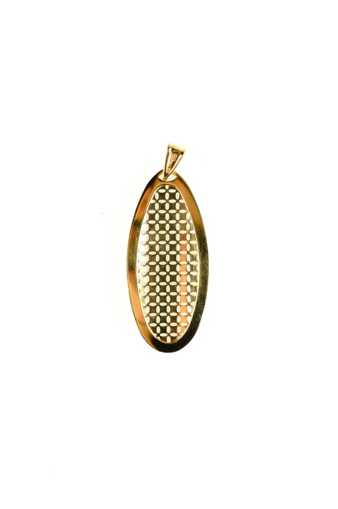 Zlatý přívěs o ryzosti 585/1000, punc labuť, váha 2,02 g, výška včetně očka 31 mm, šířka v nejširším bodě 6 mm.