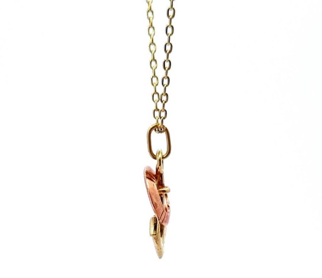 Zlatý přívěs o ryzosti 585/1000, punc čejka. Váha 1,38 g, výška včetně očka 21 mm, v nejširším bodě 13 mm.