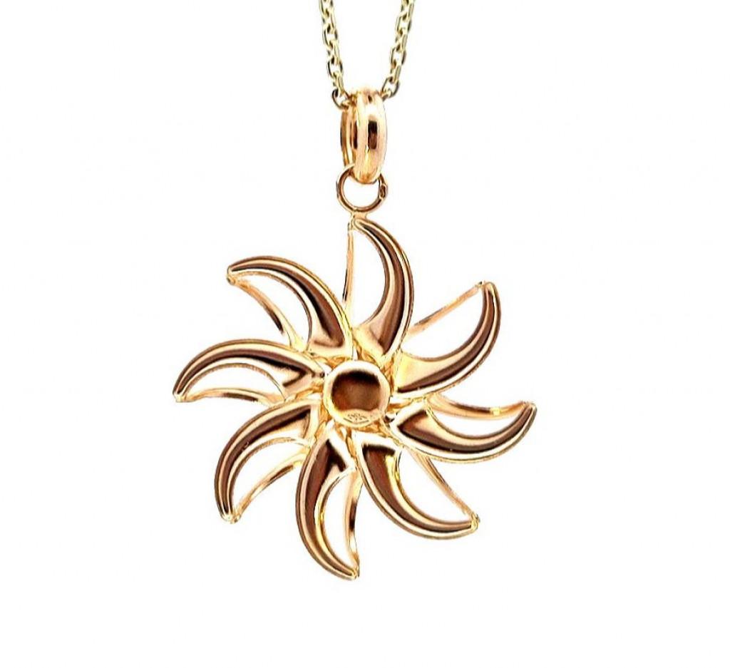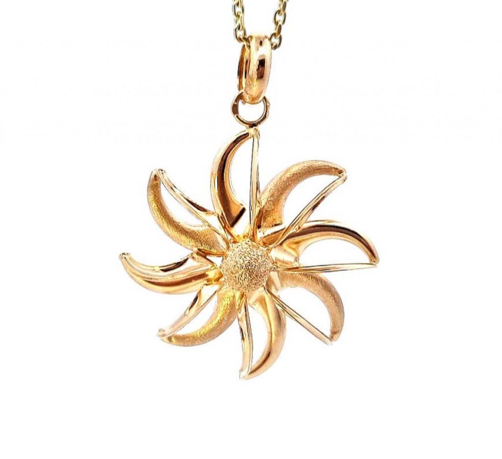 Zlatý přívěs, kytka ze žlutého zlata o ryzosti 585/1000, punc labuť. Váha 2,42 g, průměr 31 mm, výška i s očkem 42 mm.