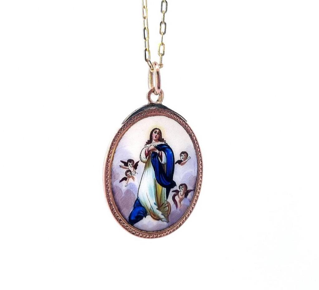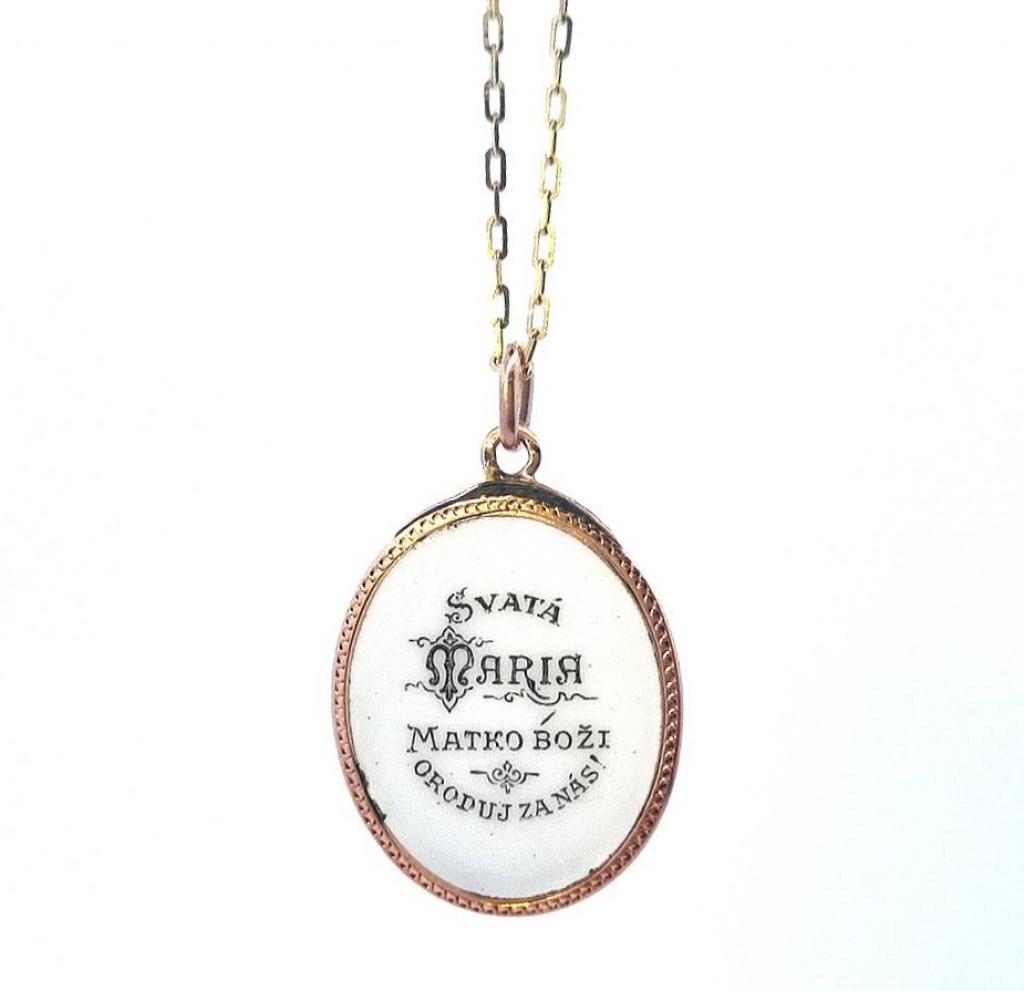Zlatý přívěs o ryzosti 585/1000, velké závěsné očko je 333/1000 a uchycení malého očka je z obecného kovu. Ke šperku je osvědčení z puncovního úřadu. Váha 3,34 g, výška včetně očka 33 mm, v nejširším bodě 20 mm.
