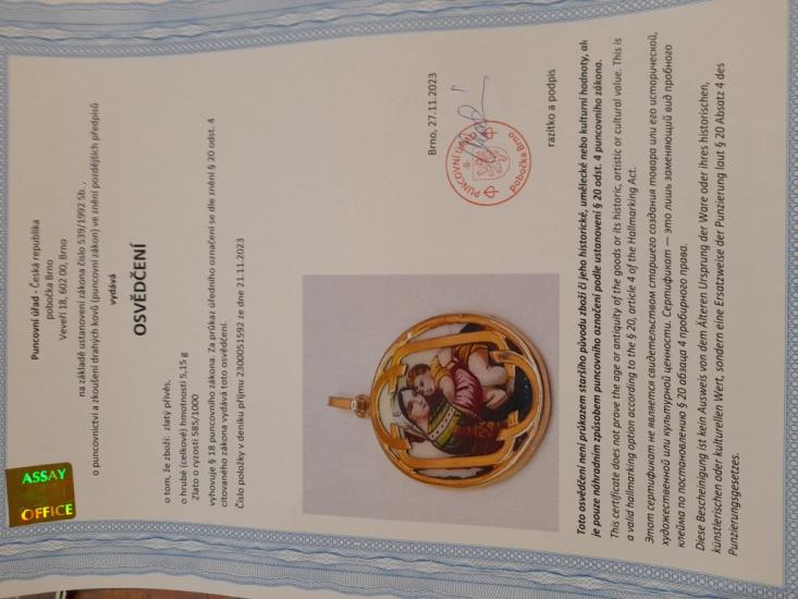 Zlatý přívěs o ryzosti 585/1000, osvědčení z PÚ. Váha 5,15 g, výška včetně očka 32 mm, v nejširším bodě 24 mm.