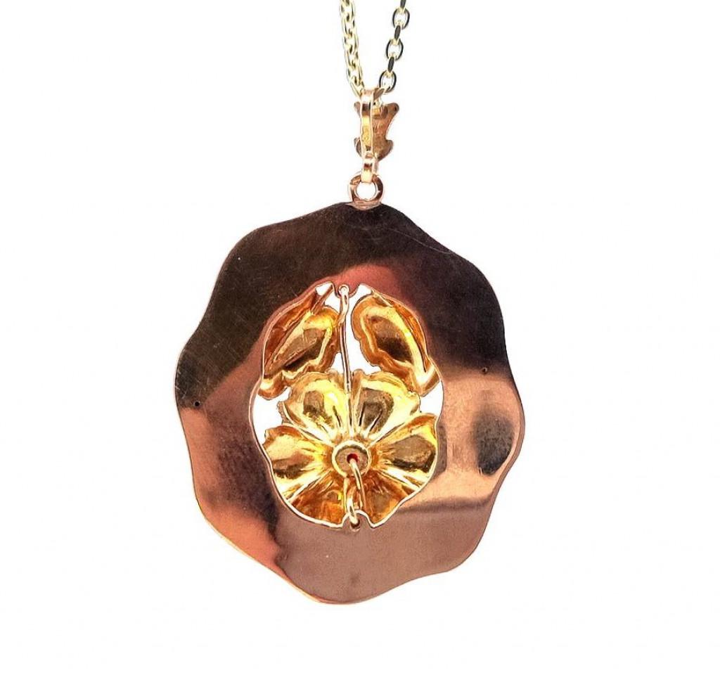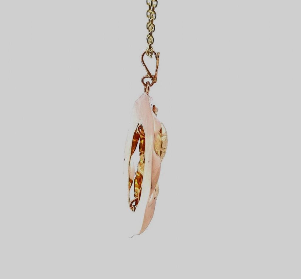 Zlatý přívěs o ryzosti 585/1000, punc labuť. Váha 4,21 g, výška včetně očka 34 mm, v nejširším bodě 29 mm.