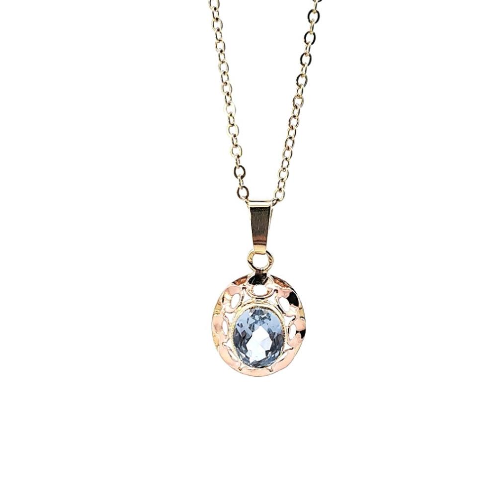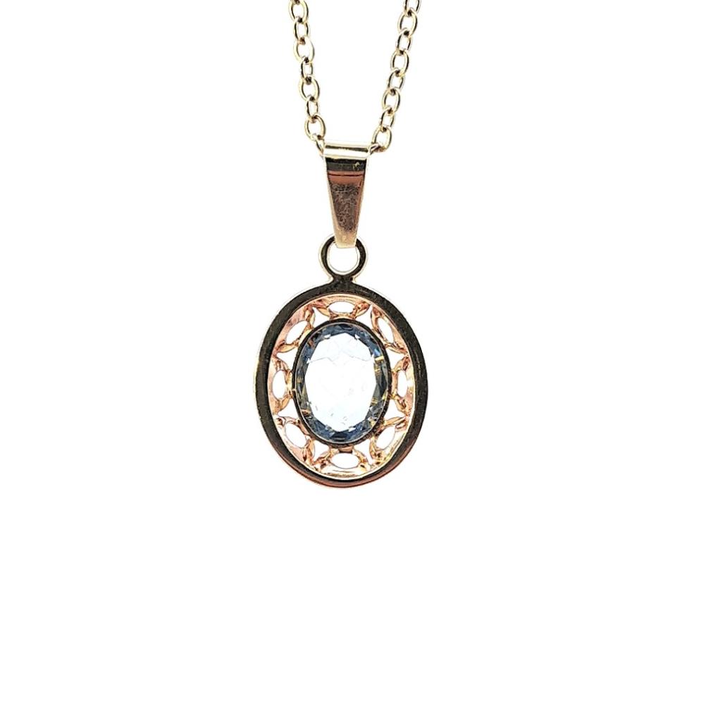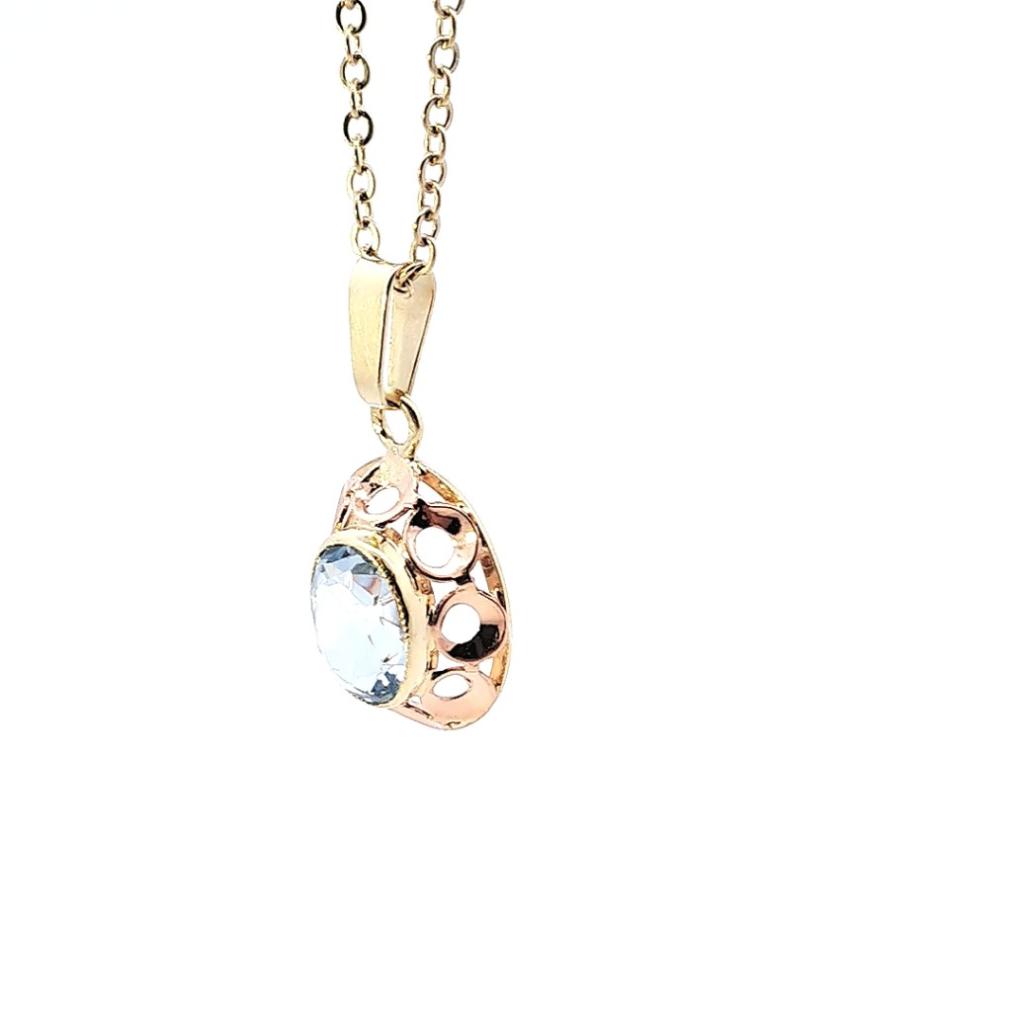 Zlatý přívěs s modrým kamenem, akvamarín. Ryzost 585/1000, punc čejka. Váha 1,90 g, výška i s očkem 25 mm, šířka 13 mm. Kámen je syntetický.