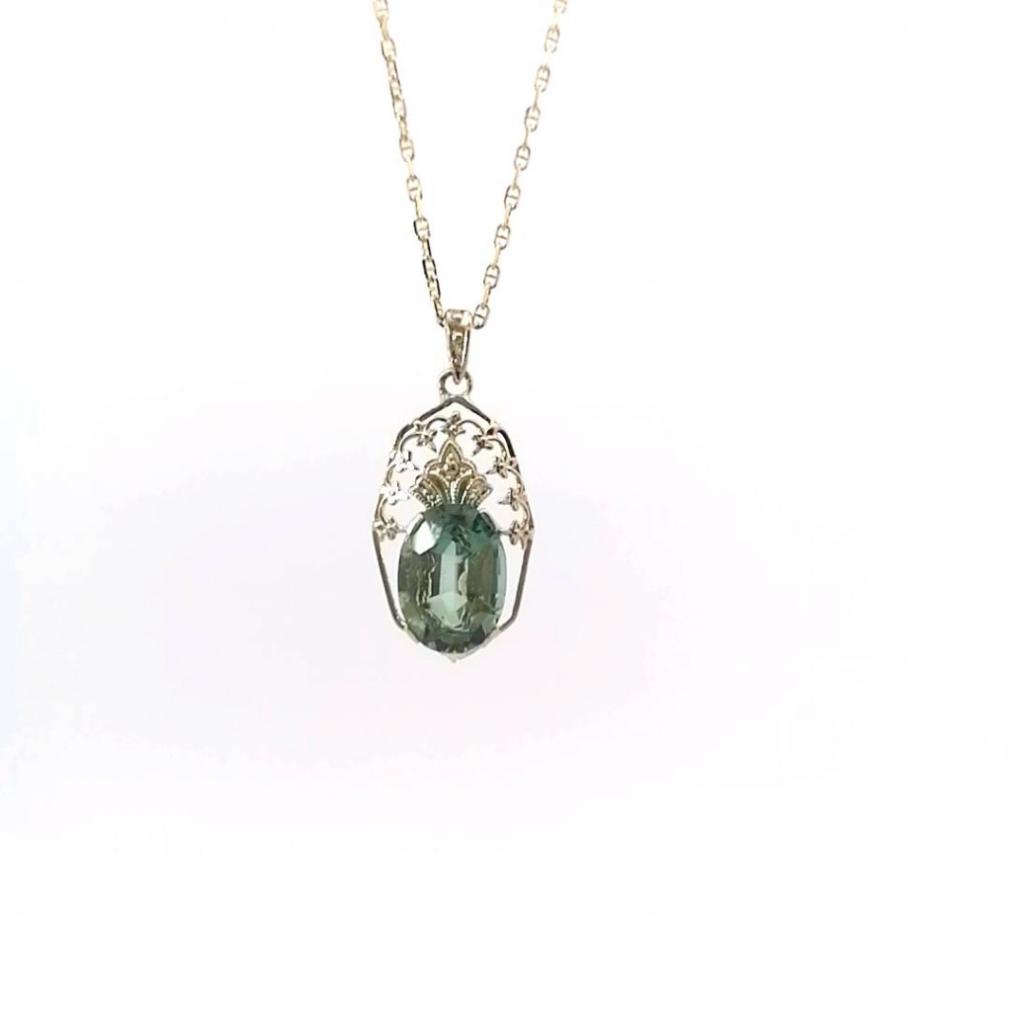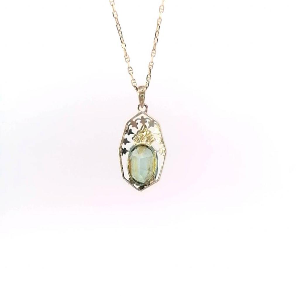 Zlatý přívěs o ryzosti 585/1000, punc labuť. Váha 1,82 g, výška včetně očka 27 mm, v nejširším bodě 12 mm.