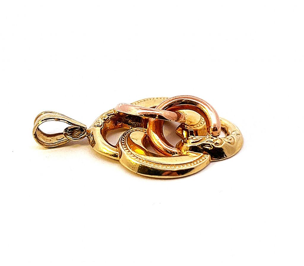 Přívěšek ze žlutého a růžového zlata o ryzosti 585/1000 s puncem labutě. Váží 3,91g, rozměry 33 x 25 mm. Celková délka 40 mm.