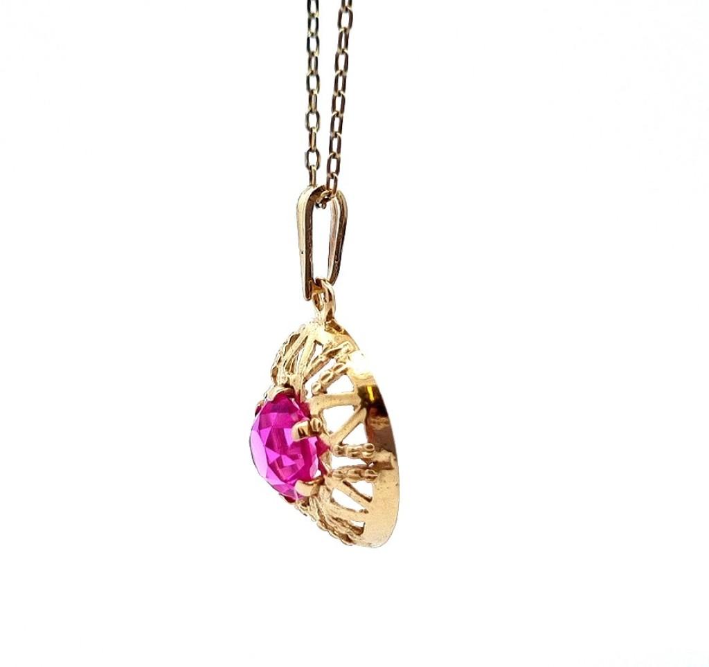 Zlatý přívěsek o ryzosti 585/1000, punc labuť, váha 2,83 g, výška celkem i s očkem 26 mm, šířka v nejširším bodě 17 mm, průměr kamene 8 mm. Kámen je syntetický.