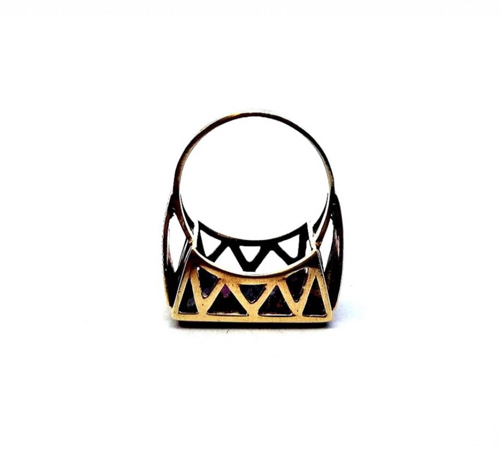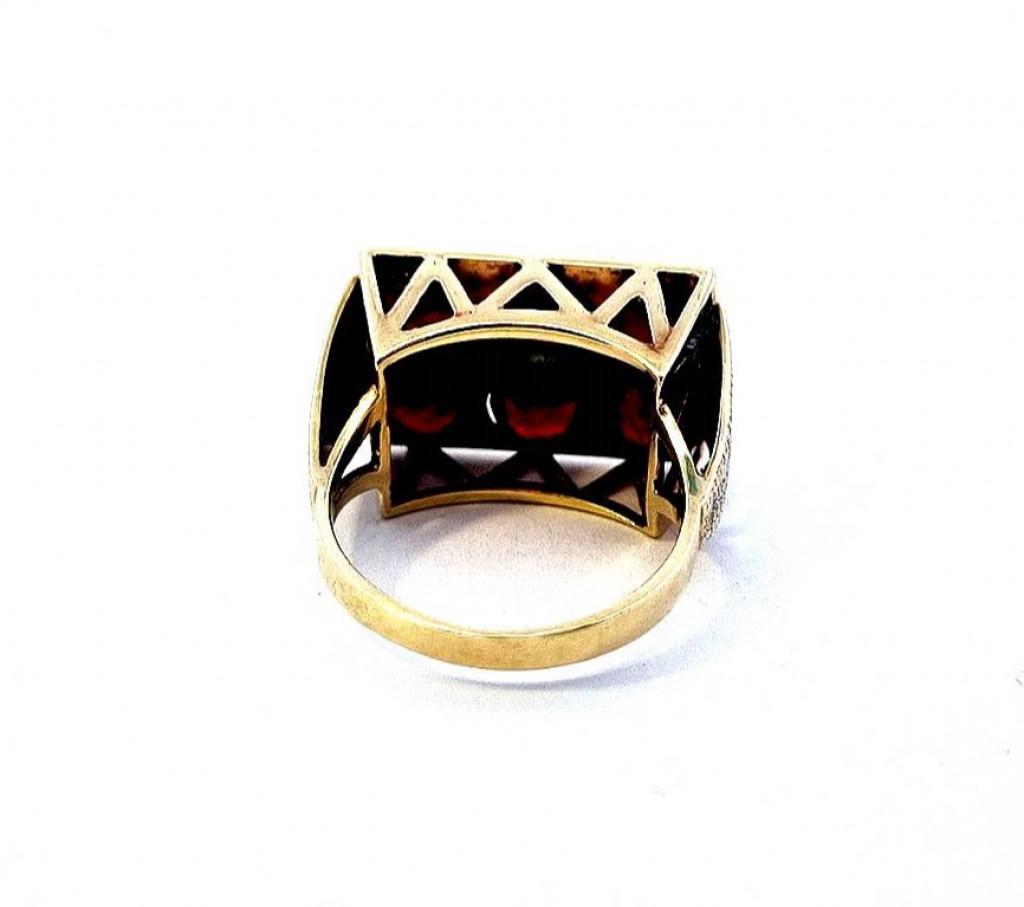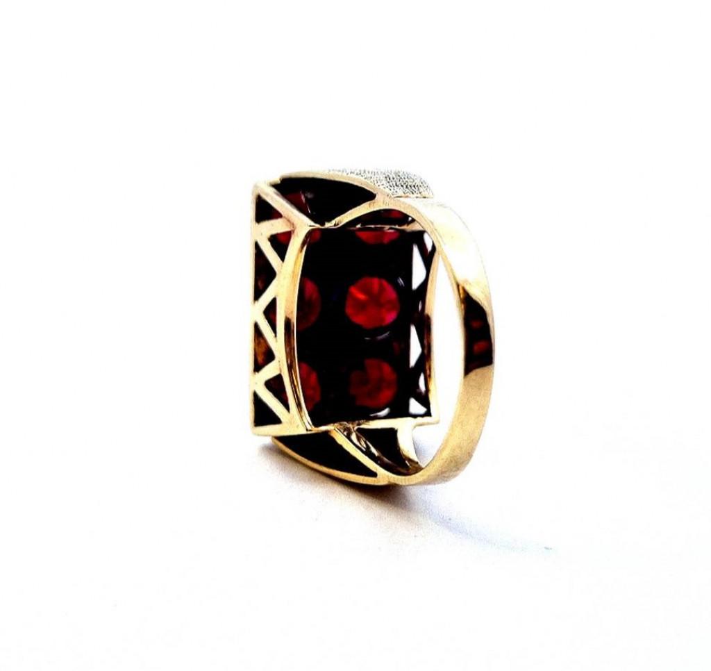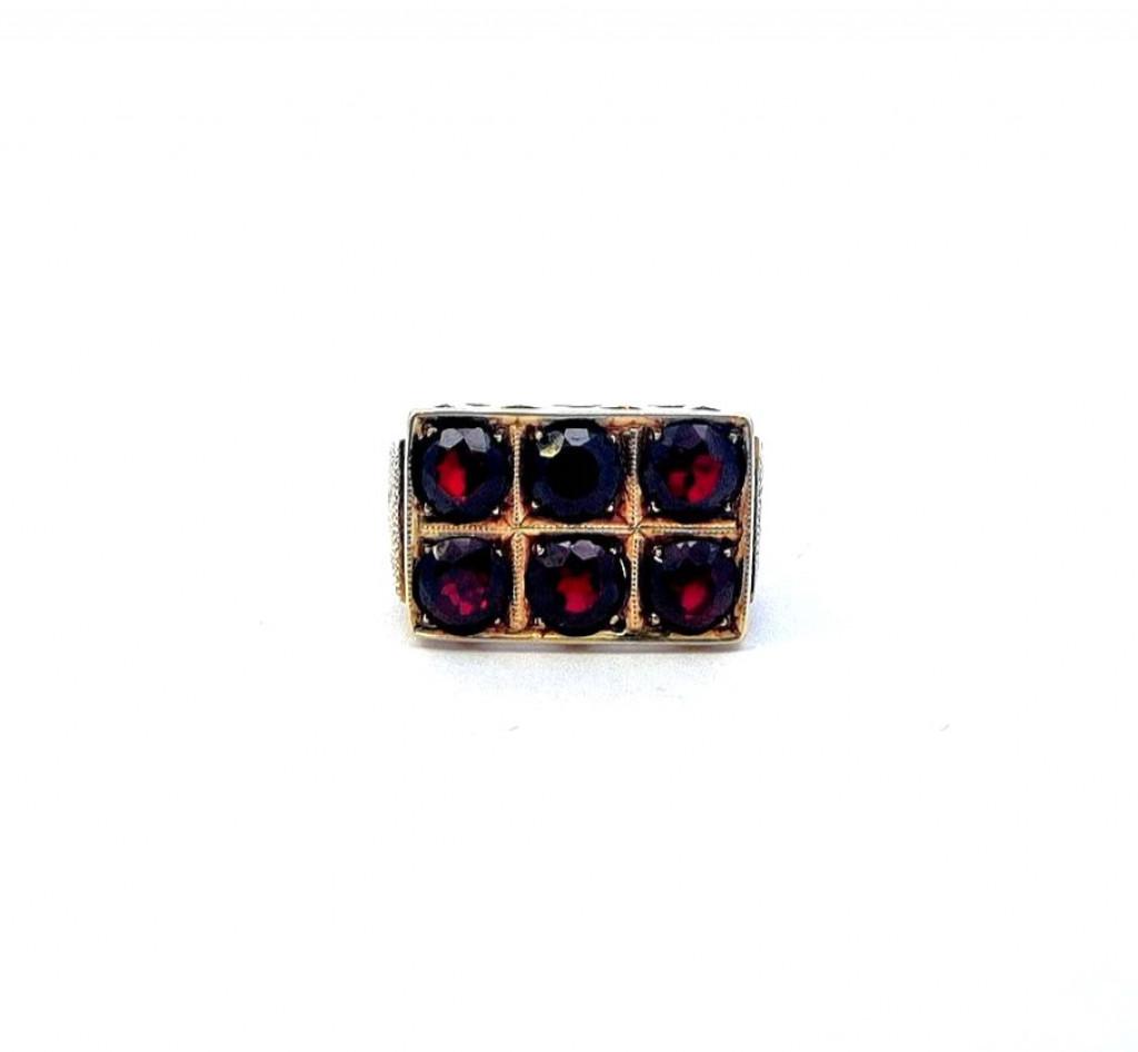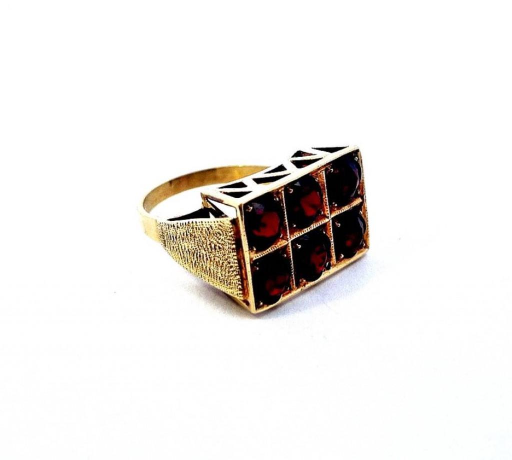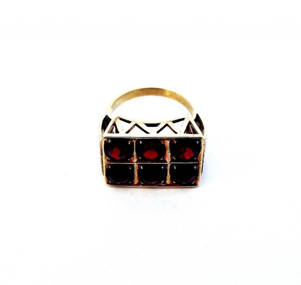 Prsten o ryzosti 585/1000, punc lvíček, 30. léta 20. století. Velikost 53, váha celkem 6,30 g. Rozměr hlavy prstenu 13 x 19,5 mm. Kámen - český granát, 6 x 0,59 ct, celkem 3,54 ct.