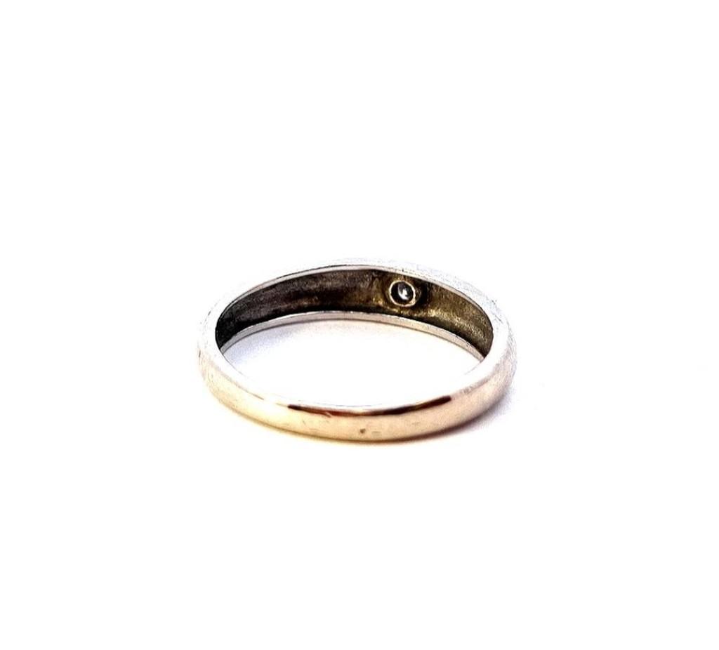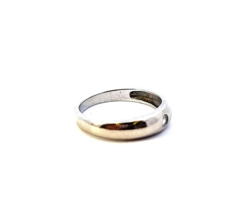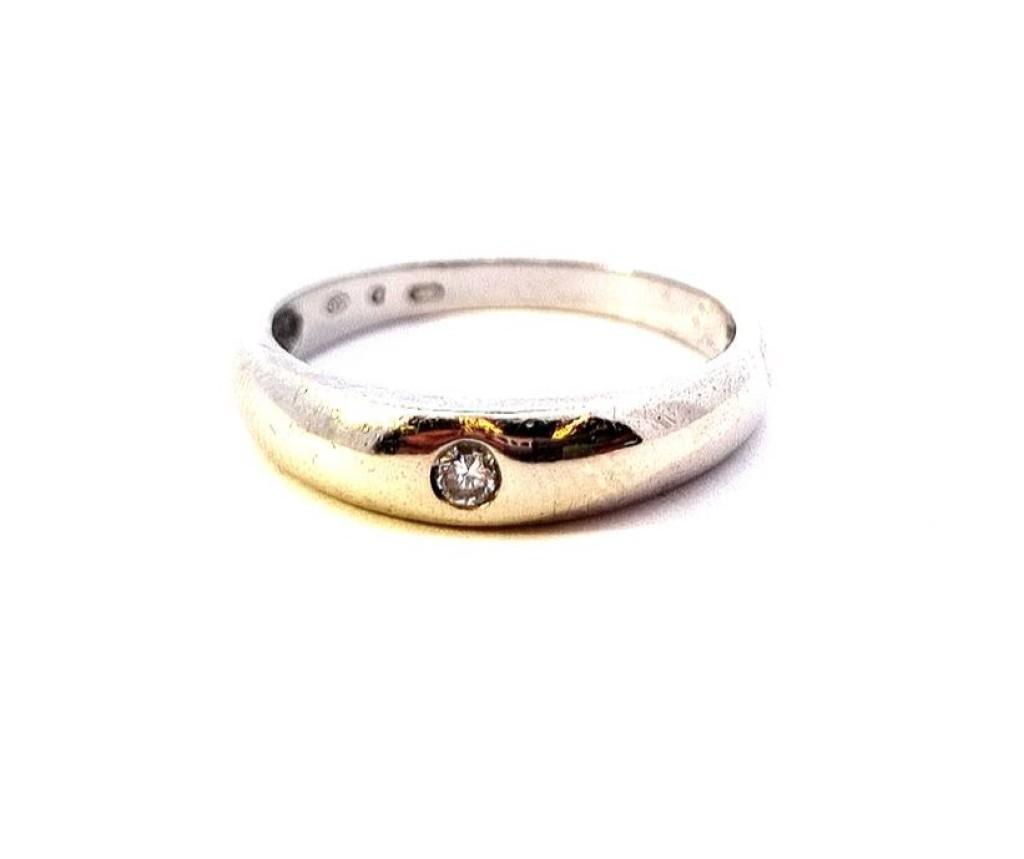 Zlatý prsten o ryzosti 585/1000, punc labuť. Velikost 51, váha 2,22 g, v nejširším bodě 4 mm. Kámen - přírodní diamant briliantového brusu - celkem 1 ks, cca 0,08 ct.