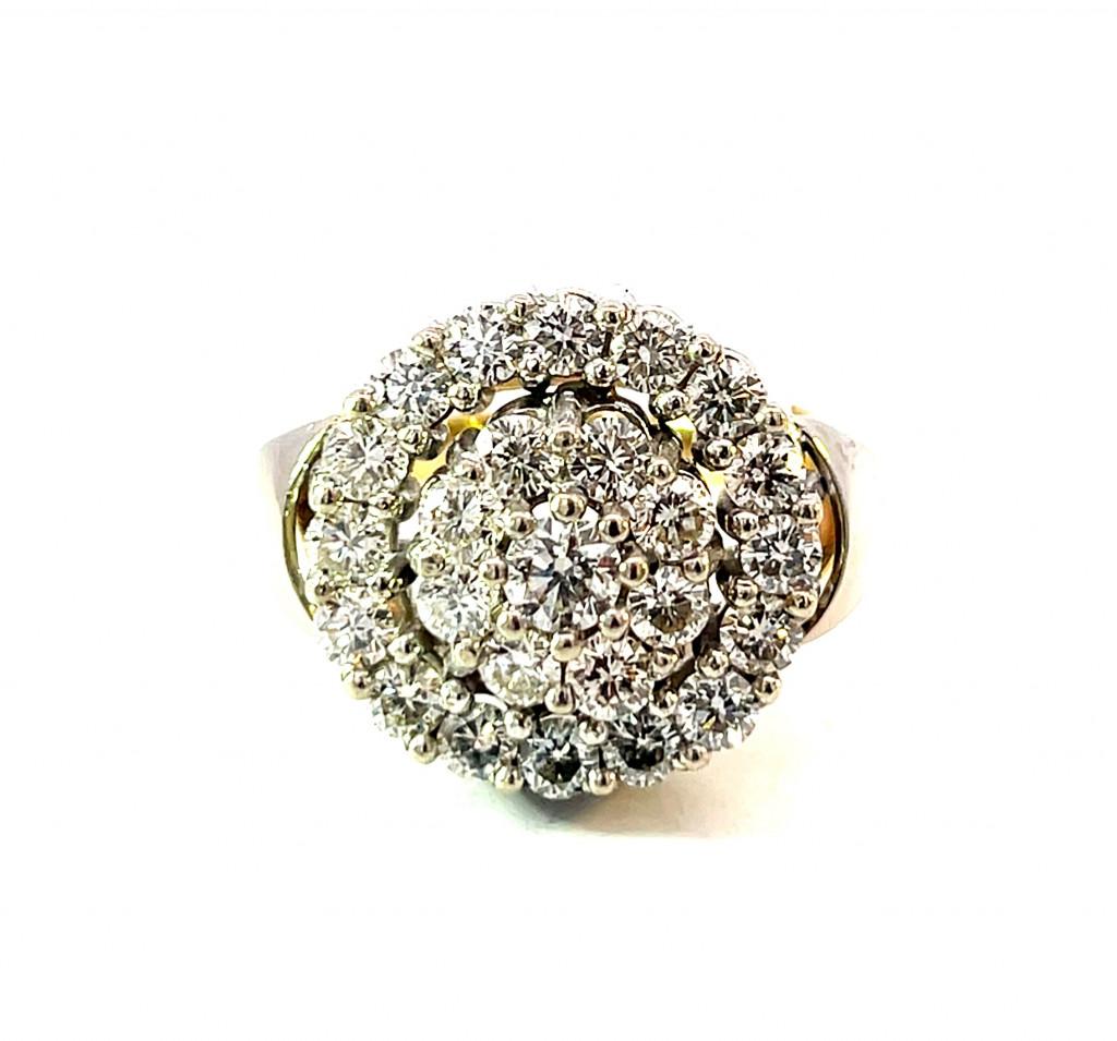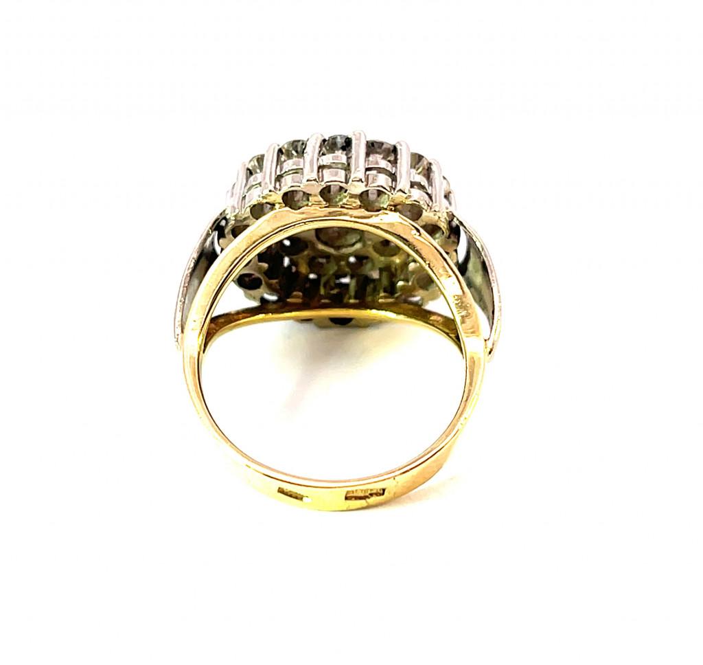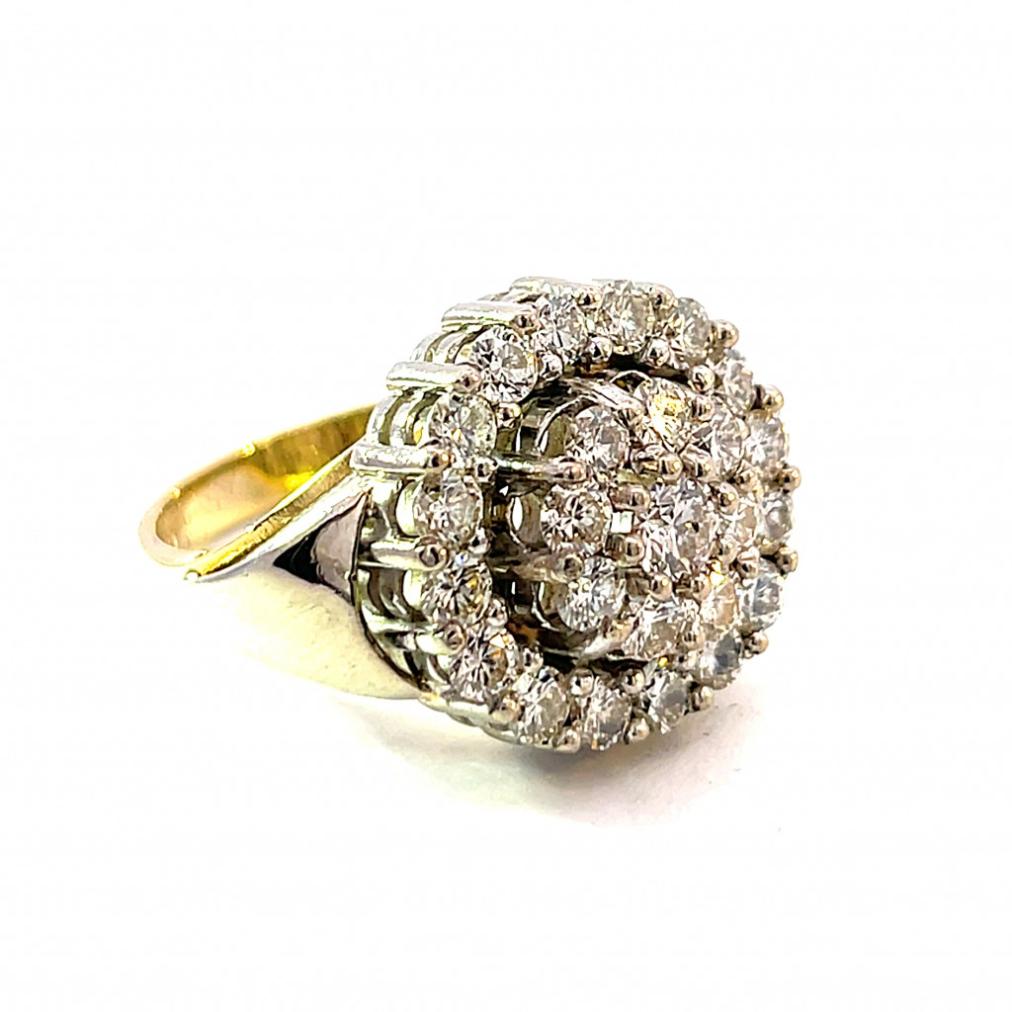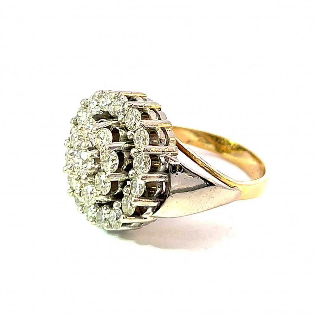 Prsten z kombinace žlutého a bílého zlata o ryzosti 750/1000, punc kohout. Velikost 57, váha 10,45 g, průměr hlavy prstenu 17 mm. Kámen - přírodní diamant briliantového brusu - celkem 25 ks, centrální kámen: 1 ks, cca 0,20 ct, ostatní kameny: 24 ks, cca 0,08 ct každý - dohromady cca 2,12 ct.