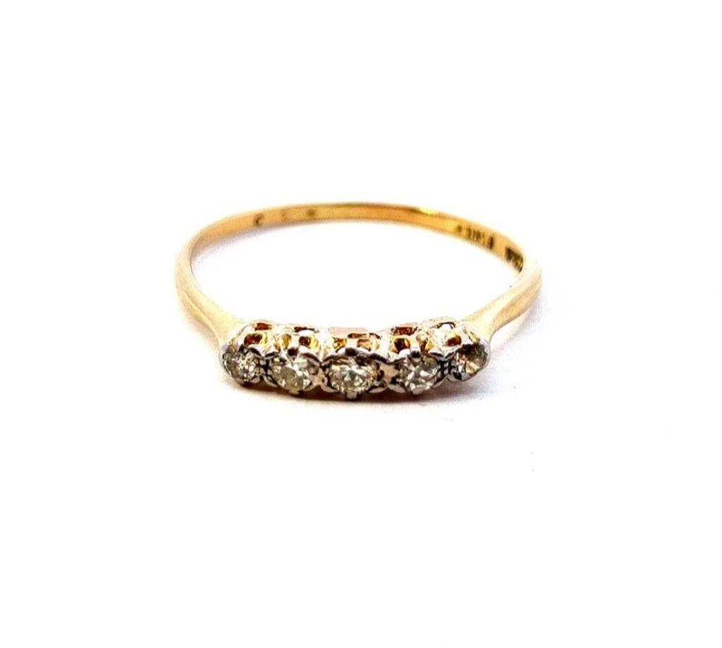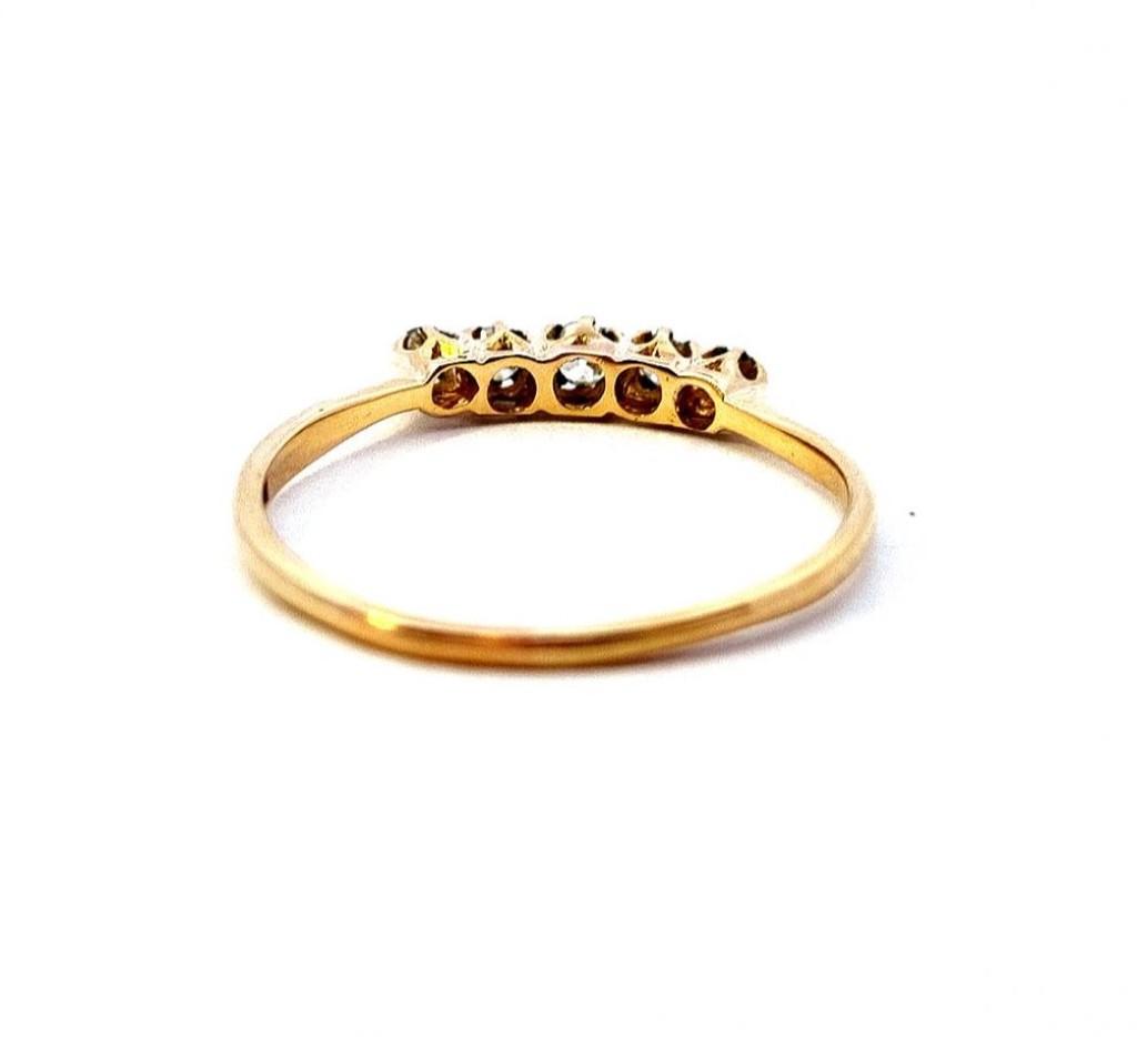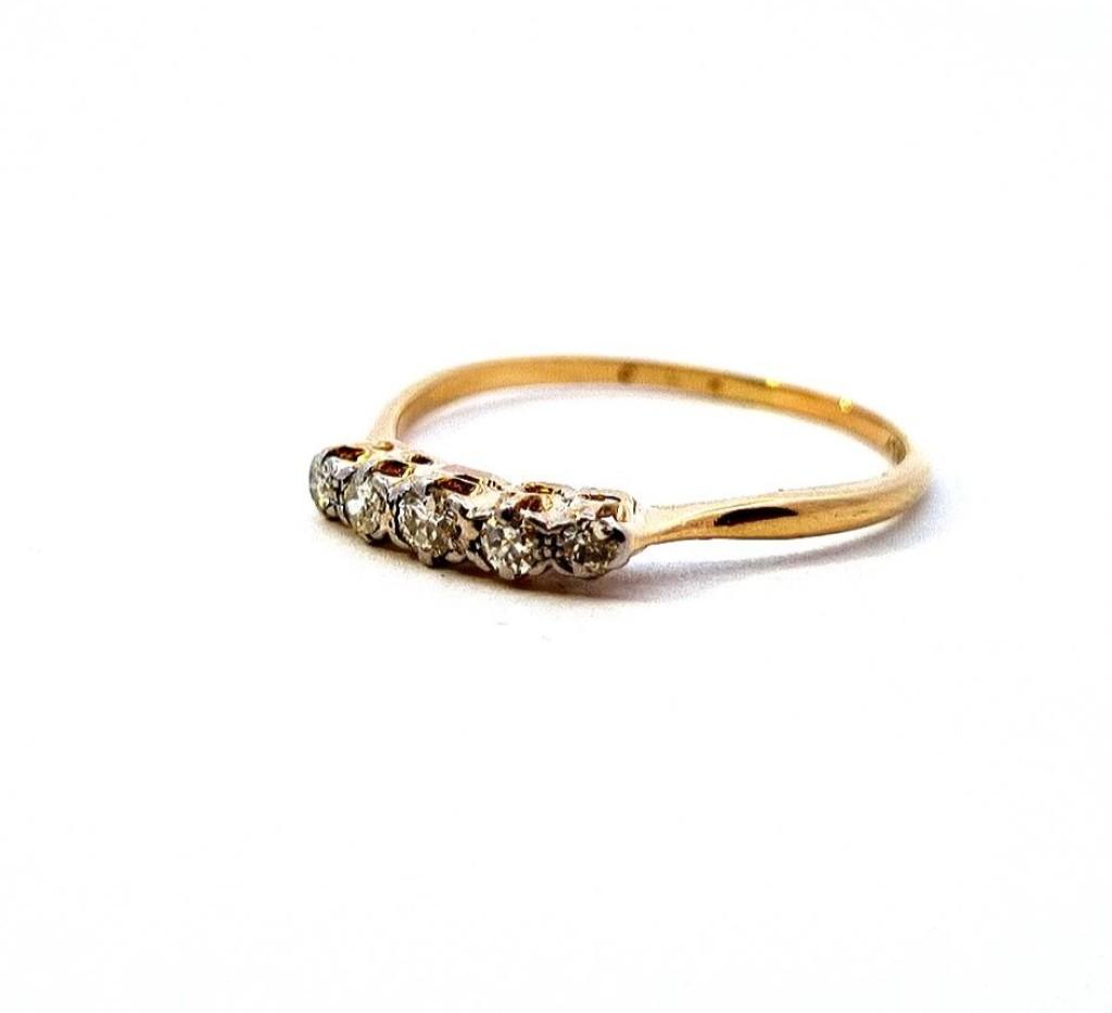 Zlatý prsten o ryzosti 585/1000, punc labuť. Velikost 61, váha 2,01 g, v nejširším bodě 3 mm. Kámen - přírodní diamant briliantového brusu - celkem 5 ks, dohromady cca 0,31 ct.