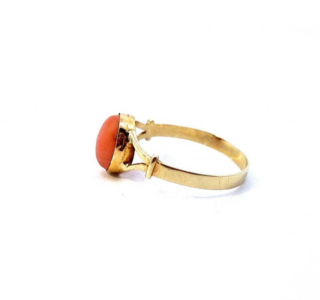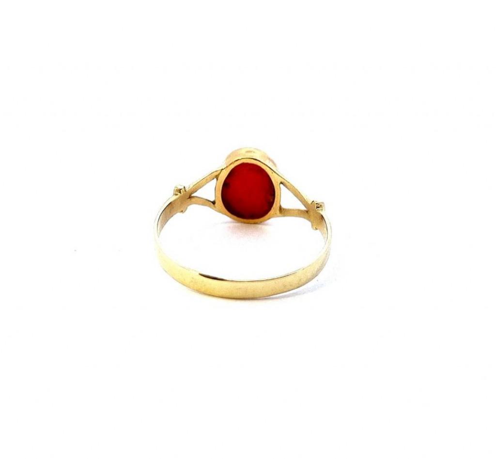 Prsten ze žlutého zlata o ryzosti 585/1000, punc labuť. Velikost 57, váha celkem 1,85 g, v nejširším bodě 9 mm.