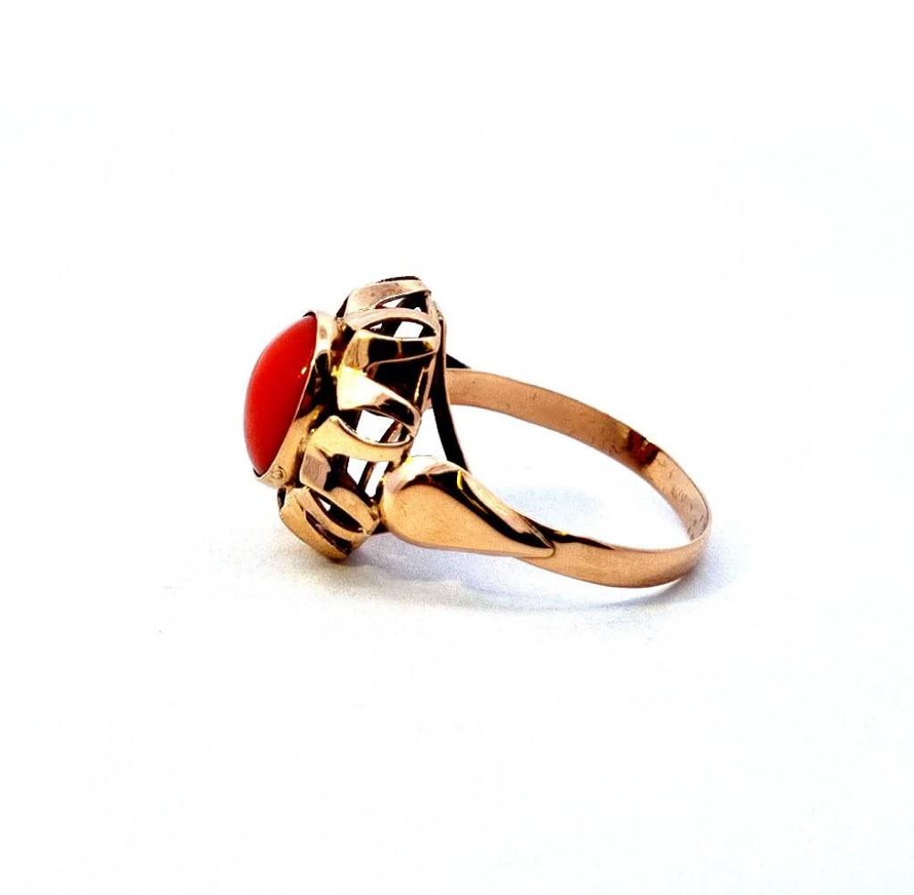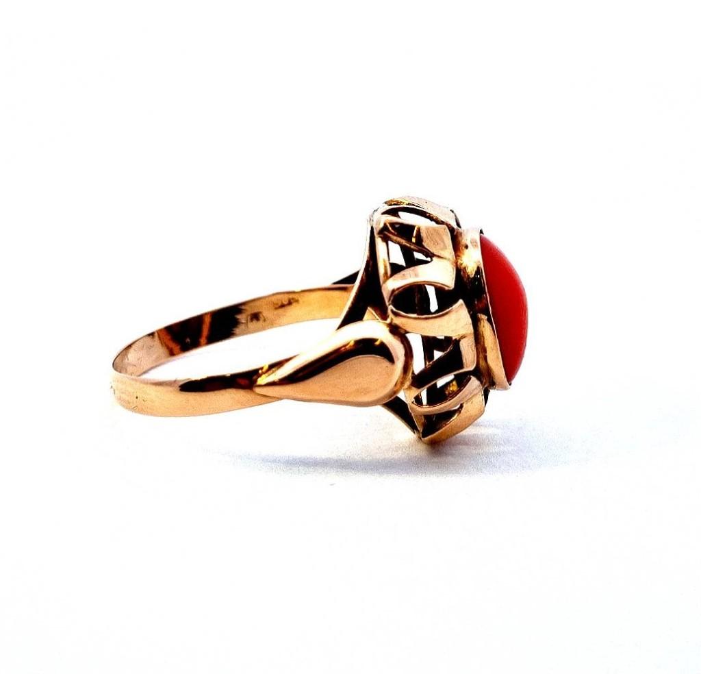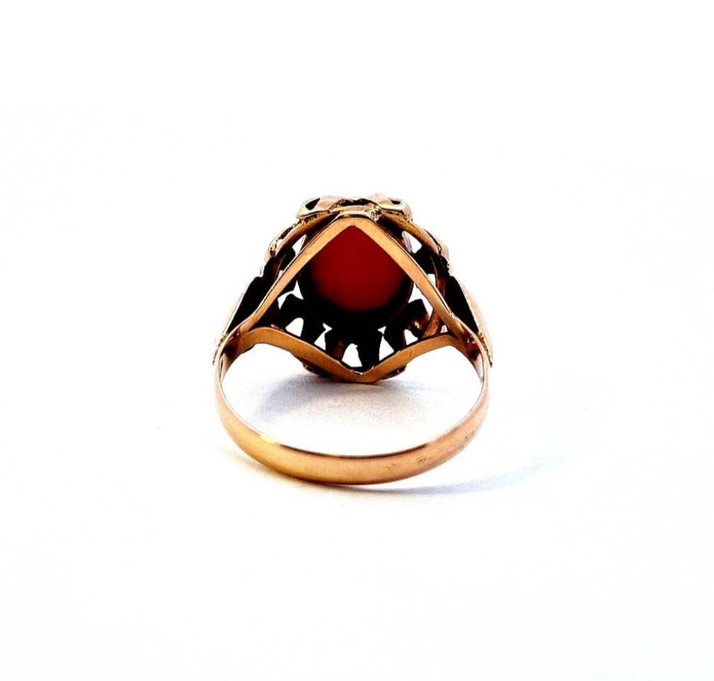 Zlatý prsten o ryzosti 585/1000, punc labuť. Velikost 58, váha 3,43 g, rozměr korálu 11 x 9 mm, rozměr celé hlavy prstenu 16 x 15 mm.