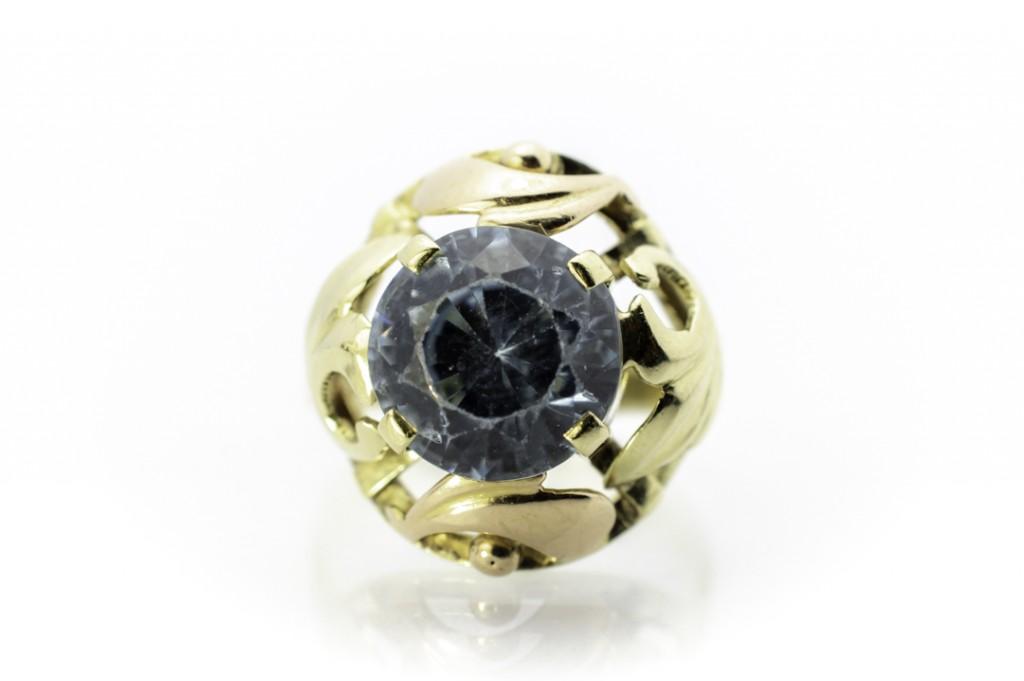 Zlatý prsten o ryzosti 585/1000, punc labuť, velikost 51, váha 4,9g, v nejširším bodě 2 cm. Kámen je mírně odřený.