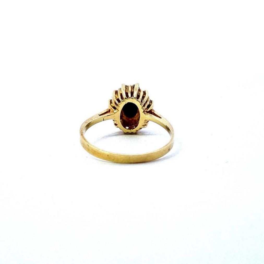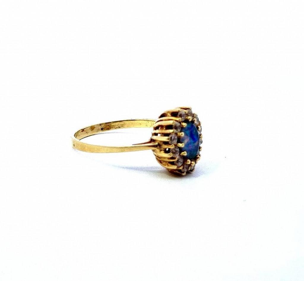 Zlatý prsten o ryzosti 585/1000, punc labuť. Velikost 59, váha 3,69 g, v nejširším bodě 12 mm. Kameny jsou syntetické.