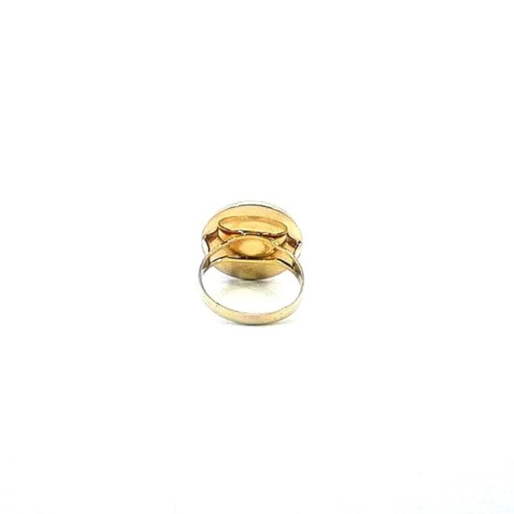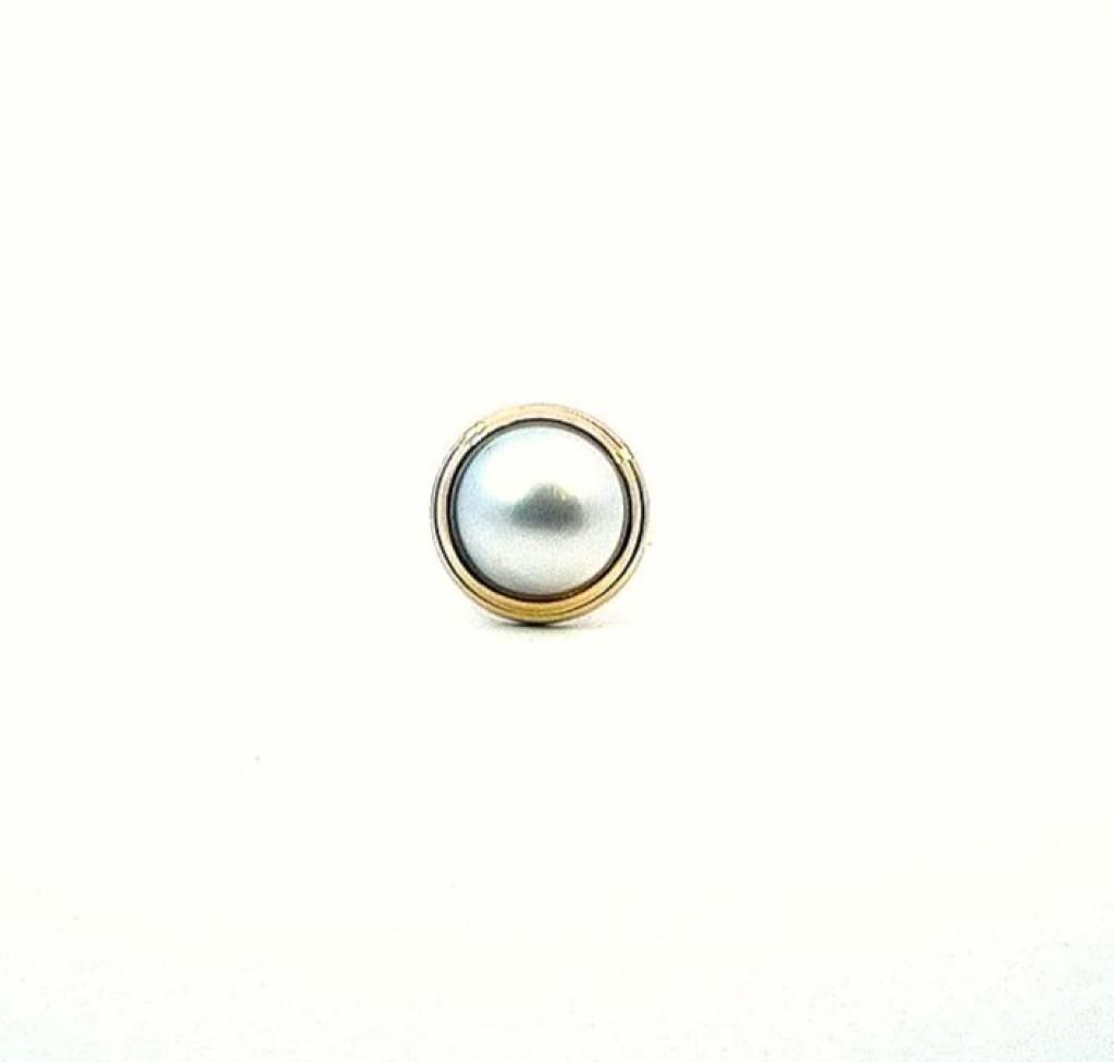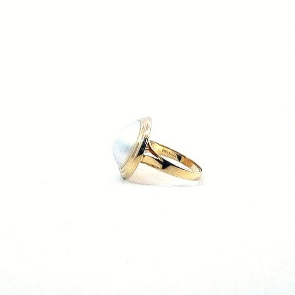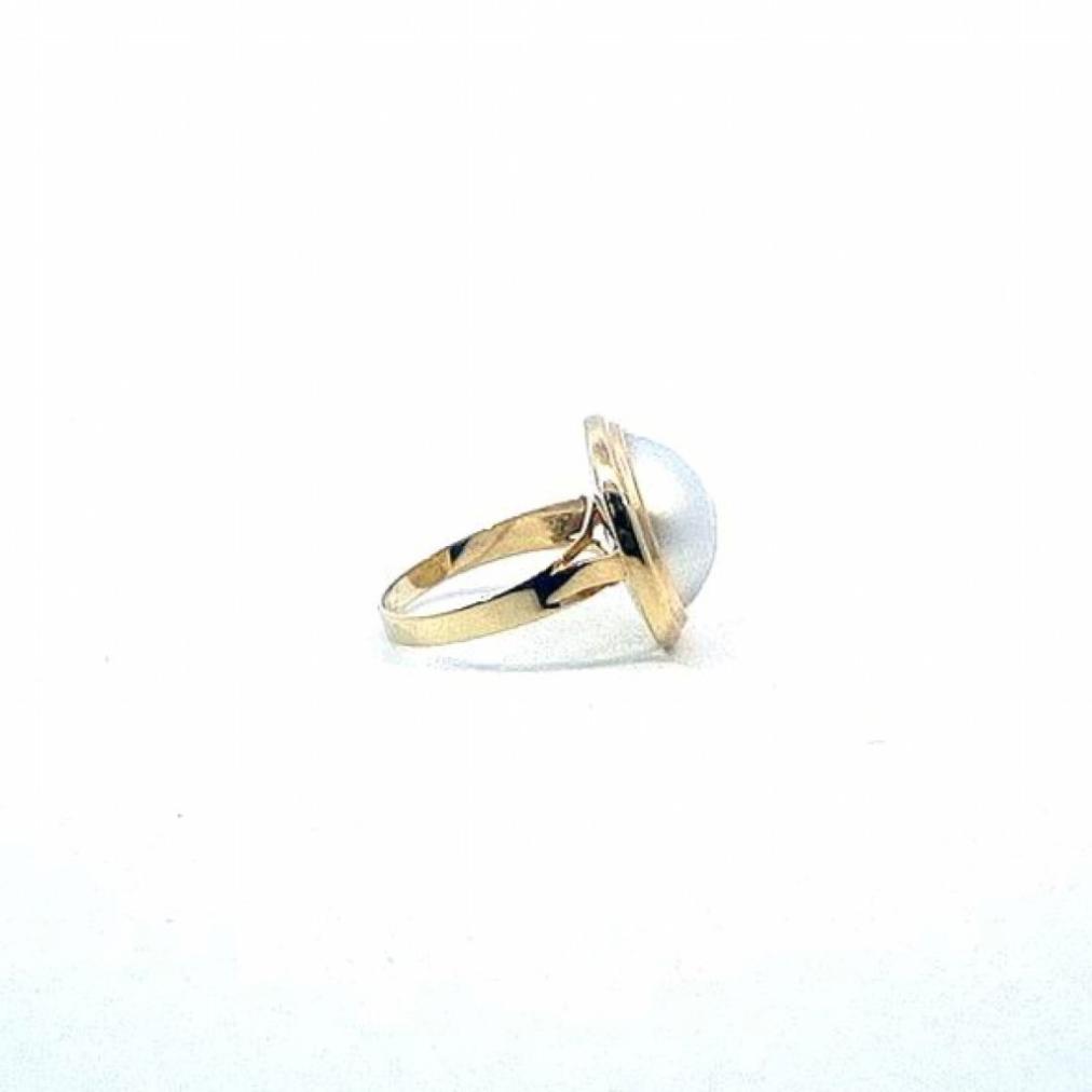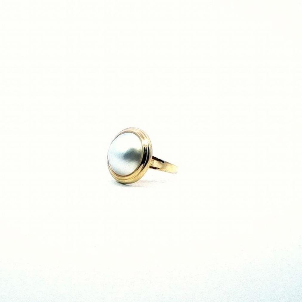 Zlatý prsten o ryzosti 375/1000, punc Z a slunce. Velikost 54, váha 3,45 g, průměr hlavy prstenu 18 mm, průměr perly 14 mm.