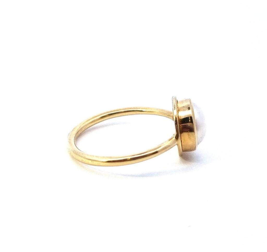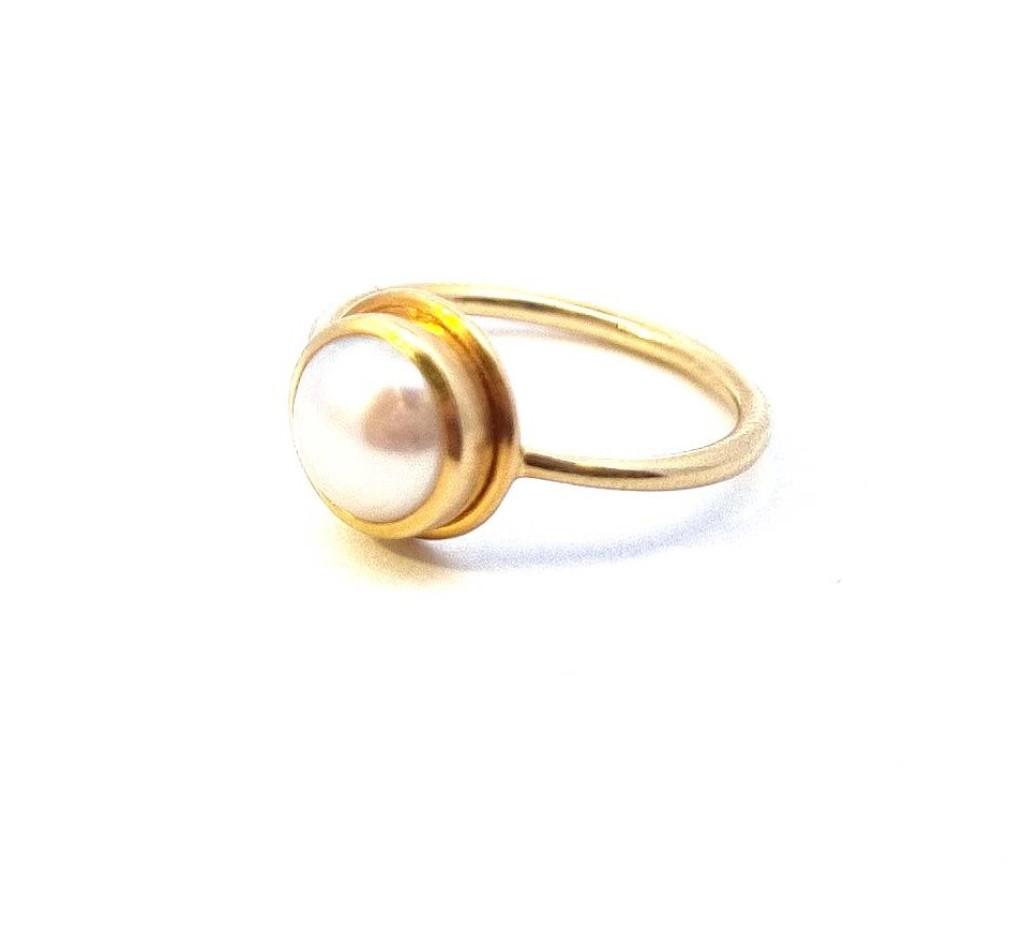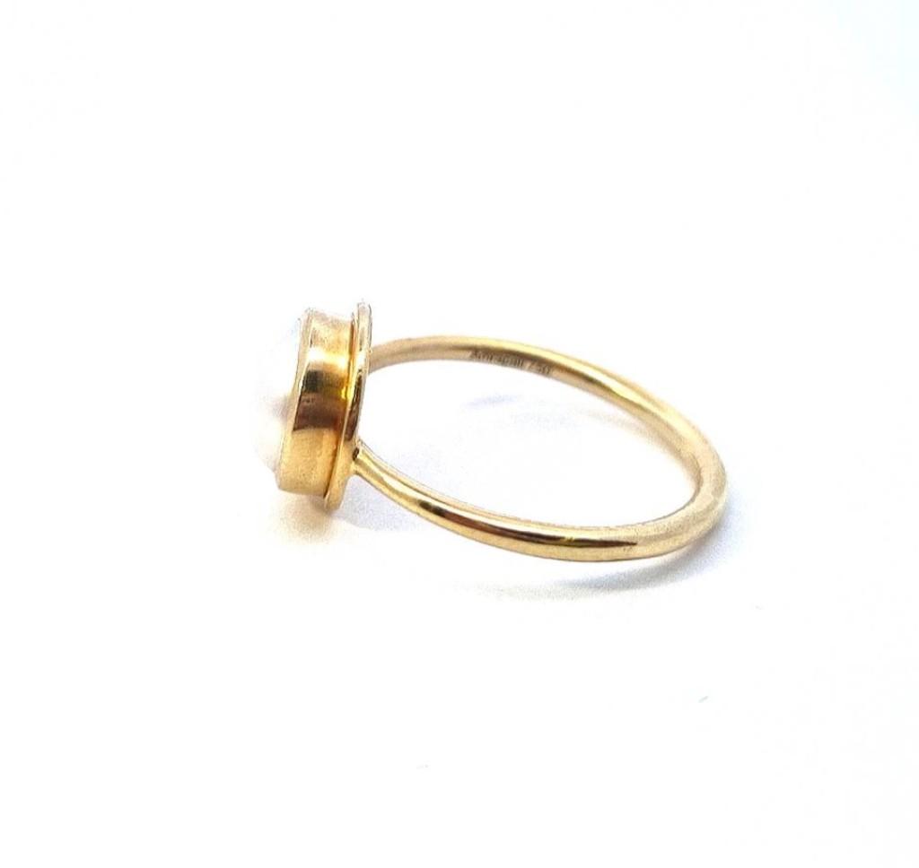 Zlatý prsten s perlou, vel. 55. Ryzost 750/1000, punc kohout, váha 3,16 g, průměr perly 7 mm, průměr celé hlavy prstenu 10 mm.