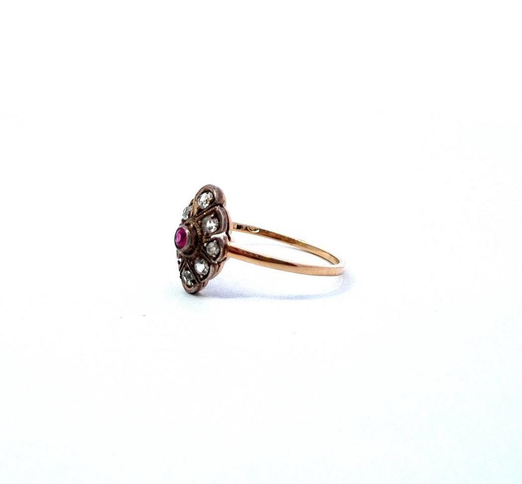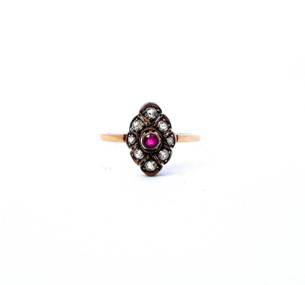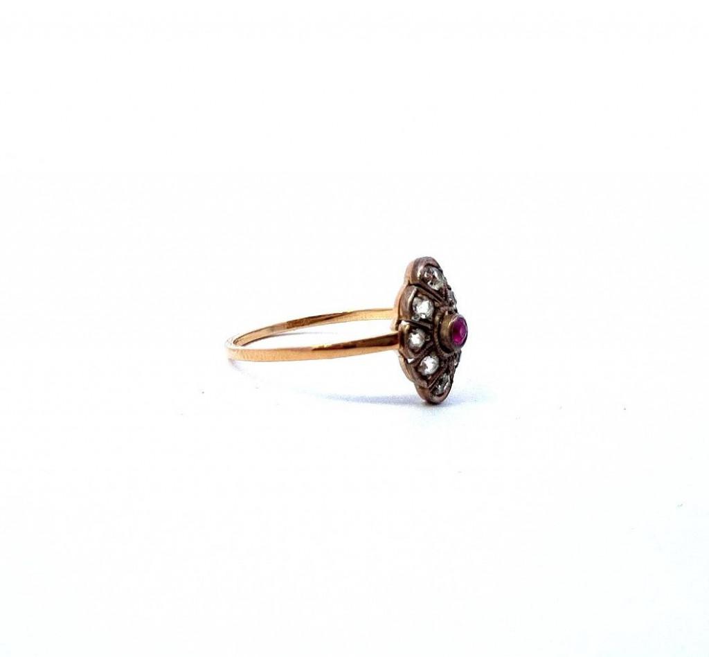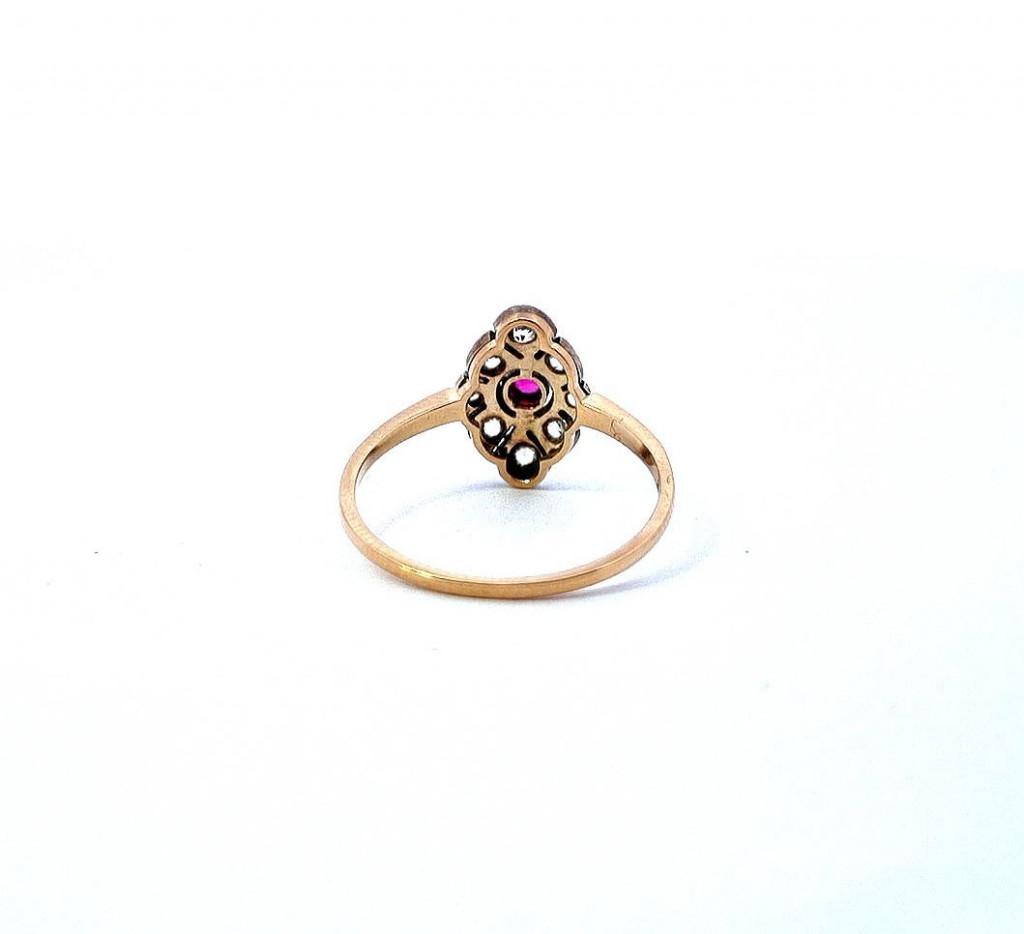 Zlatý prsten o ryzosti 585/1000, punc čejka. Velikost 57, váha 1,79 g, rozměr hlavy prstenu 13 x 9 mm. Kameny jsou syntetické.
