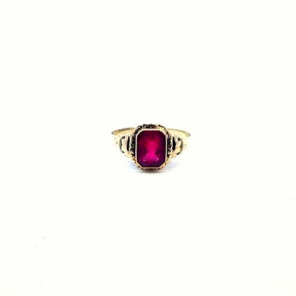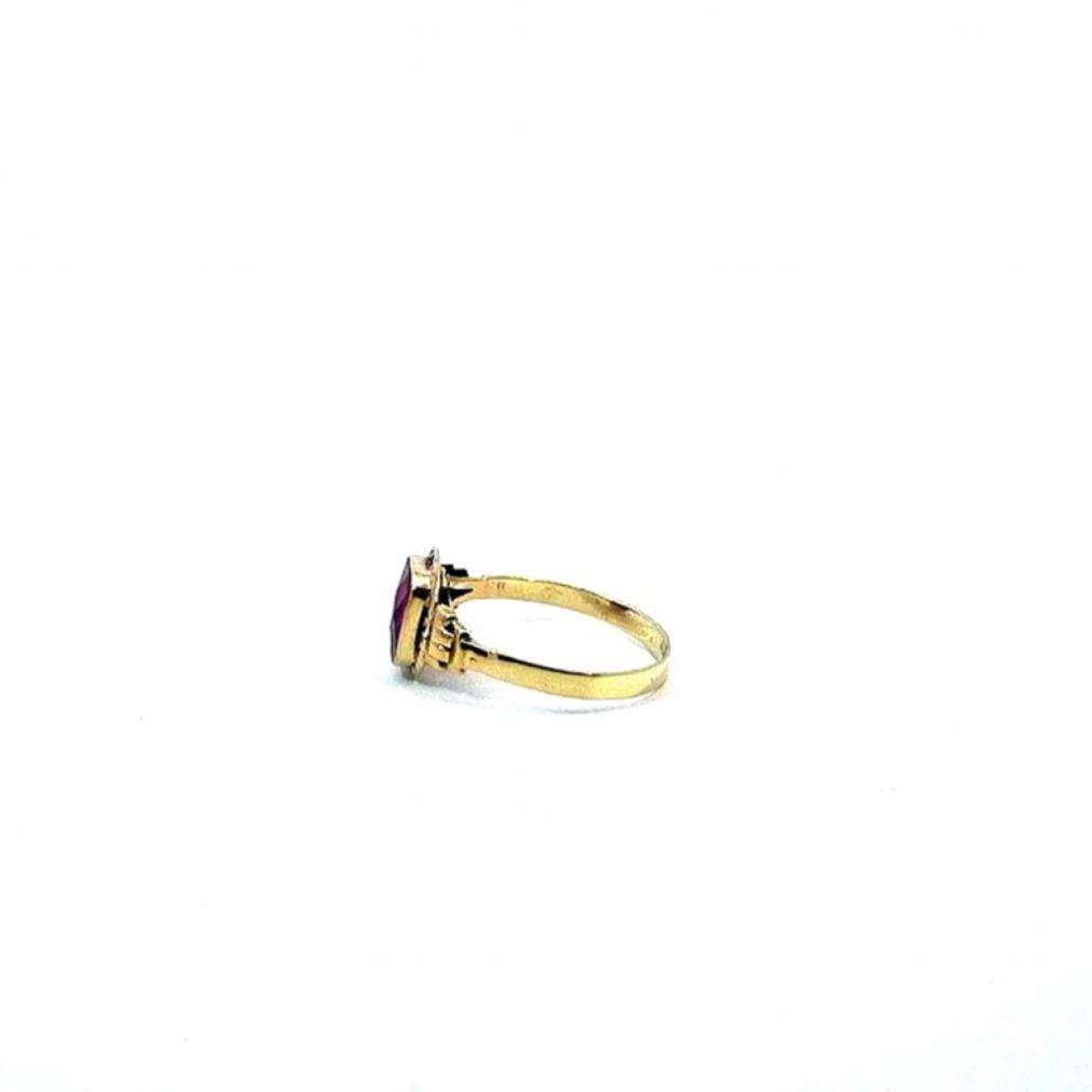 Zlatý prsten o ryzosti 585/1000, punc labuť. Velikost 54, váha 2,01 g, v nejširším bodě 10 mm. Kámen je syntetický.