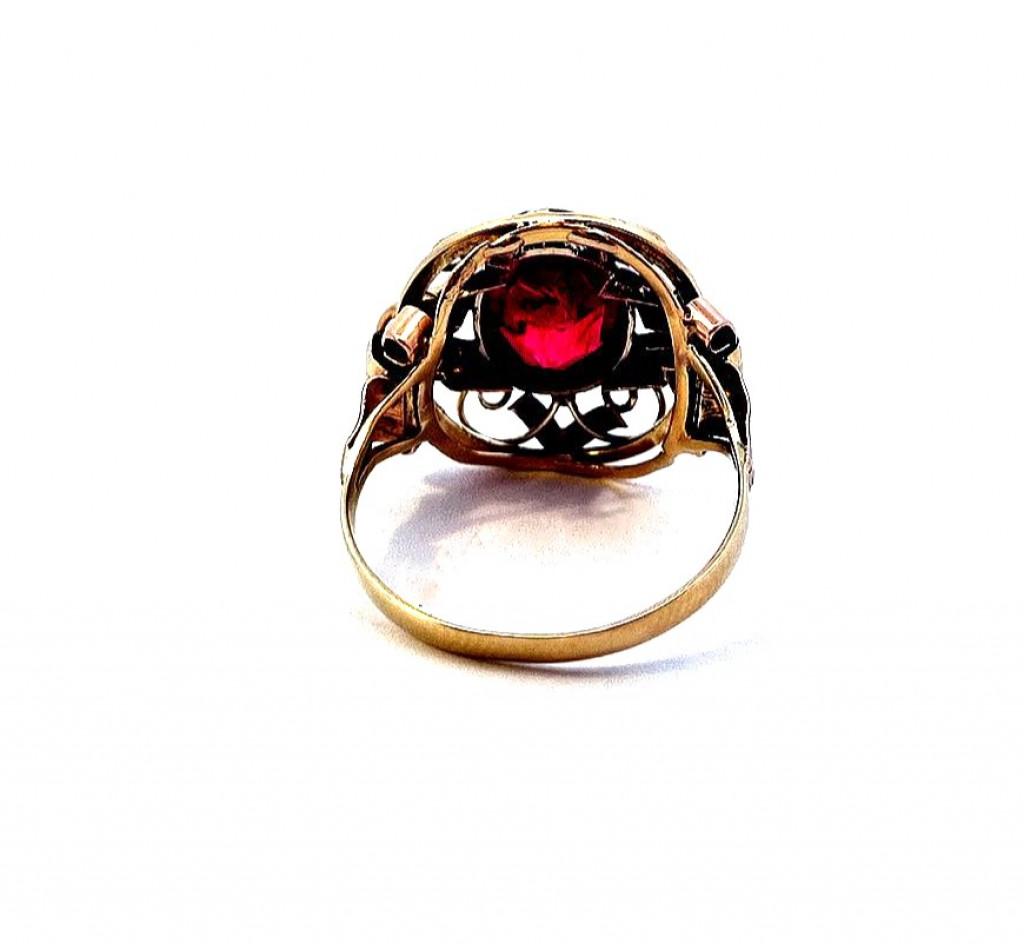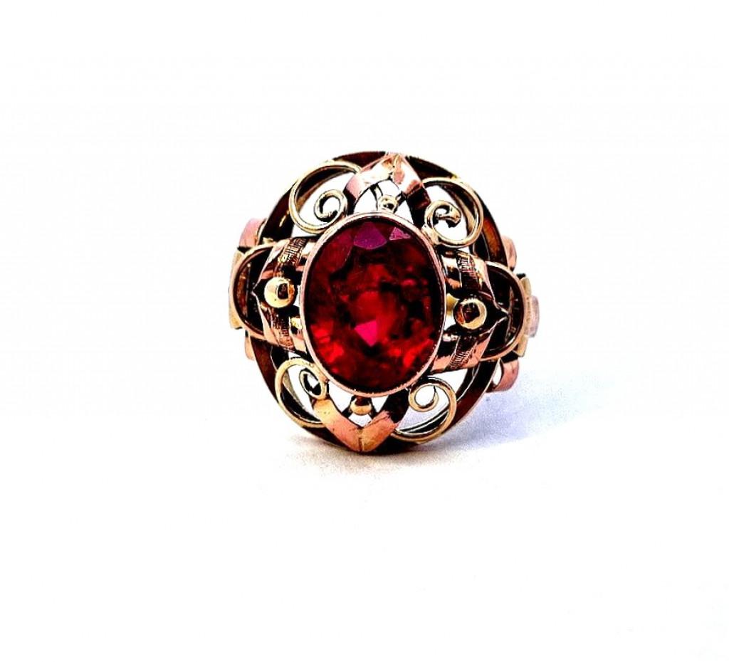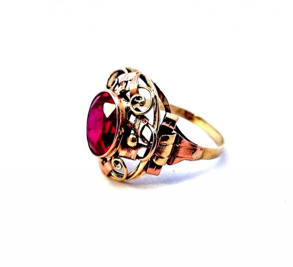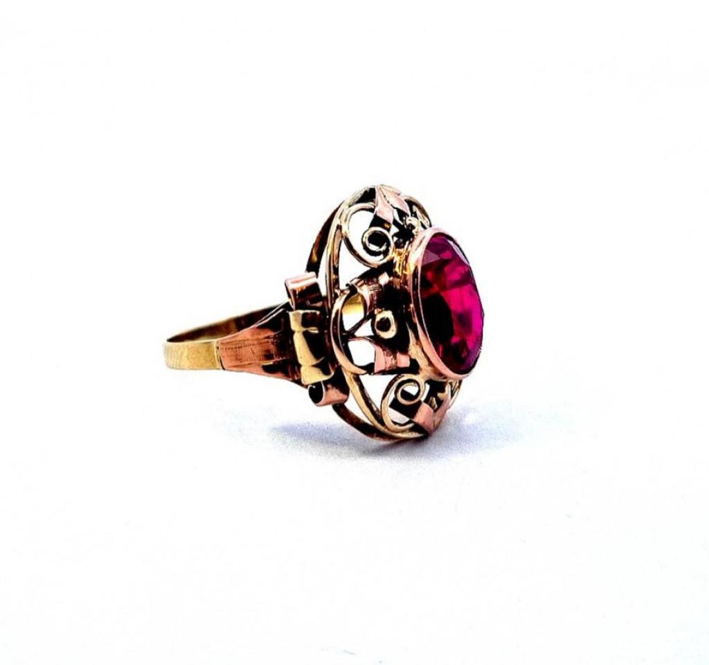 Prsten z kombinace žlutého a růžového zlata ryzosti 585/1000, punc čejka. Velikost 56, váha 3,75 g, rozměr hlavy prstenu 18 x 18 mm, rozměr kamene 11 x 8,5 mm. Kámen je syntetický.
