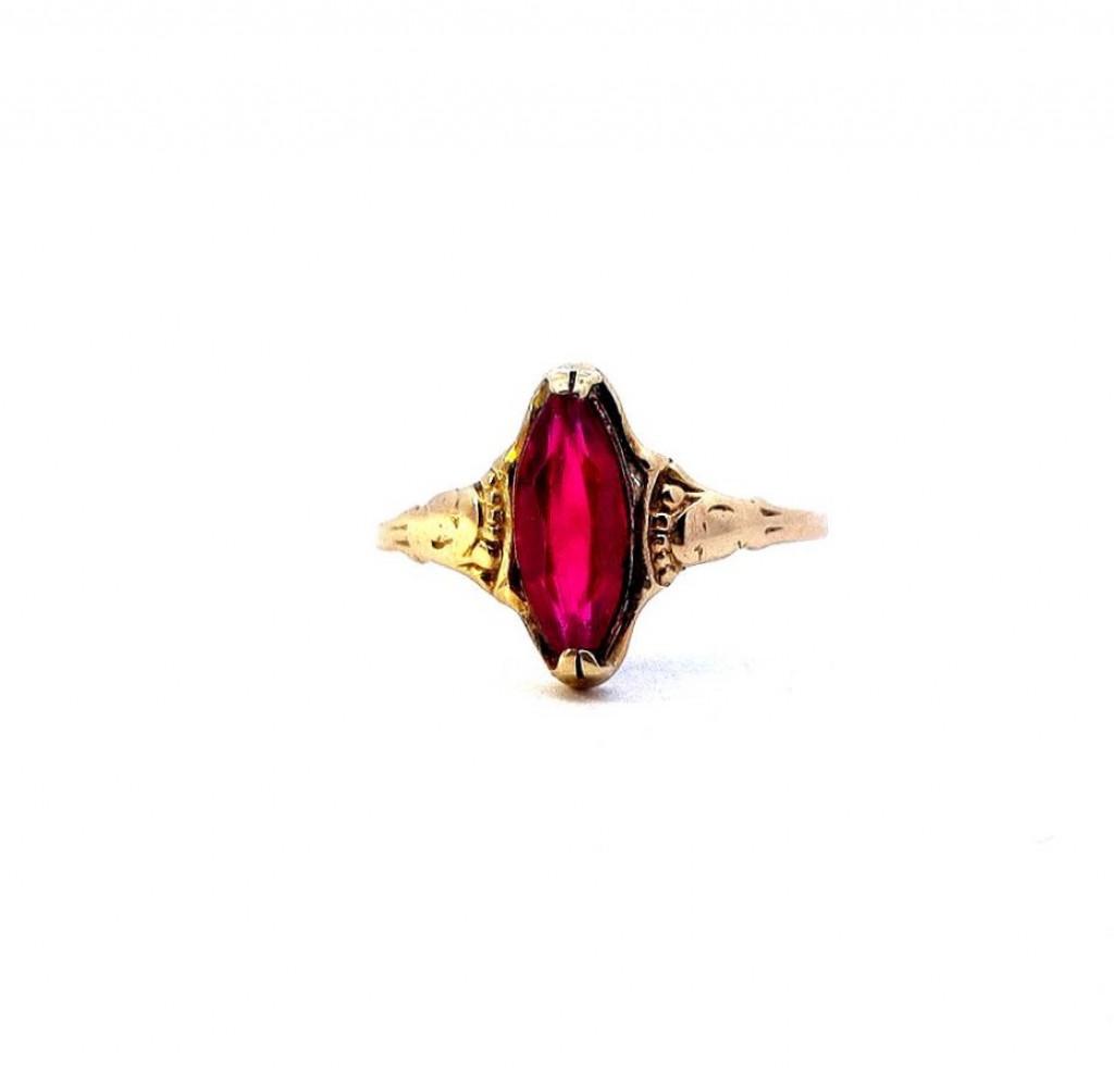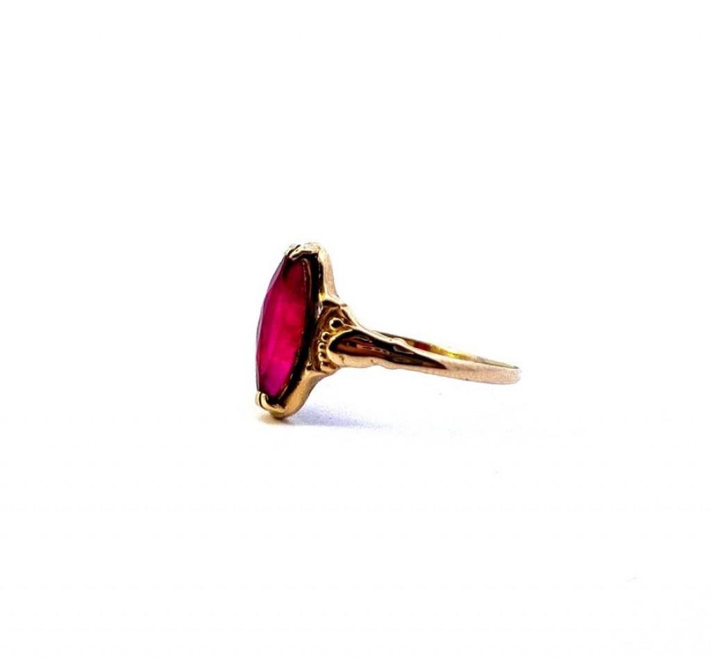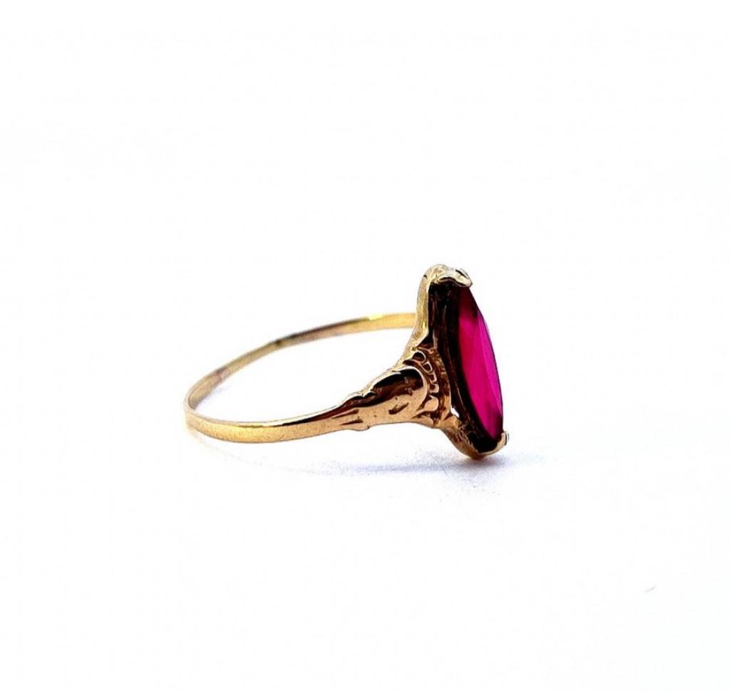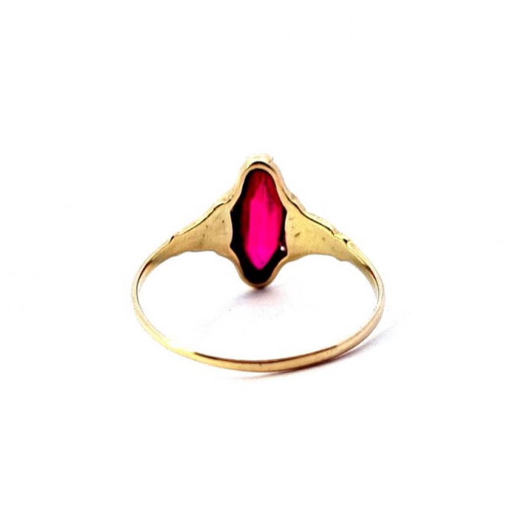 Prsten ze žlutého zlata o ryzosti 585/1000, punc labuť. Velikost 60, váha celkem 1,97 g, v nejširším bodě 13 mm. Kámen je syntetický.