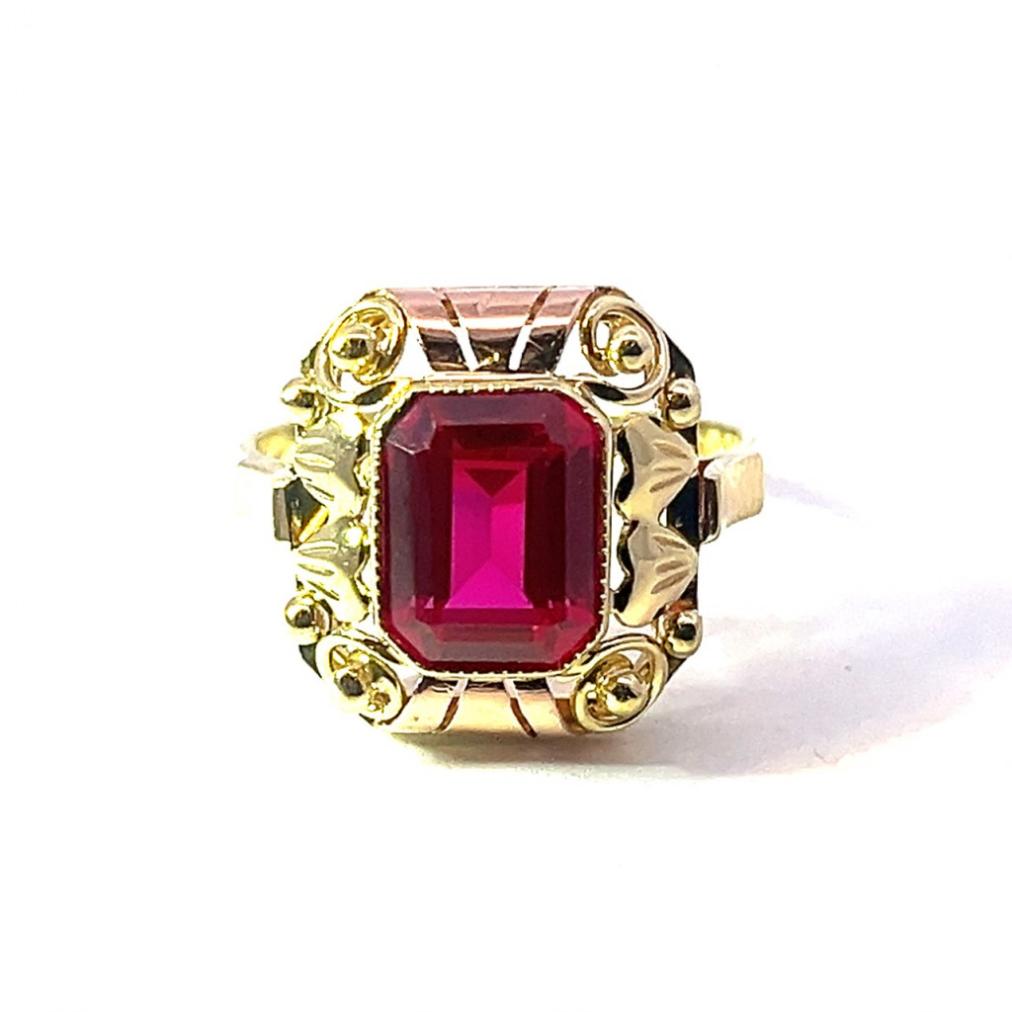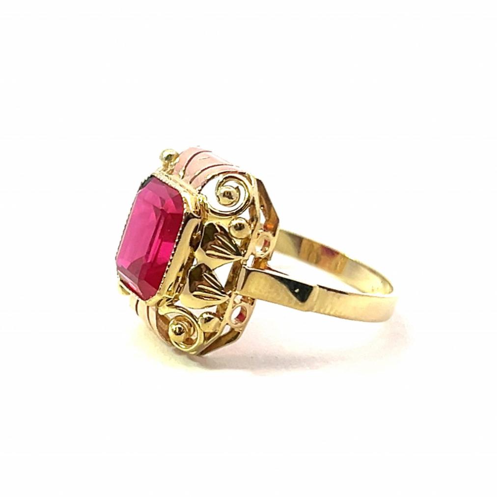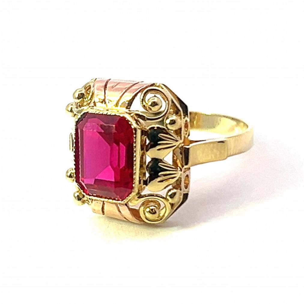Zlatý prsten v kombinaci žlutého a růžového zlata o ryzosti 585/1000 s puncem čejka s výrazným růžovým kamínkem. Váha 3,40 g, velikost 54, rozměr hlavy prstenu 15 x 13 mm, rozměr růžového kamene 7 x 9 mm.