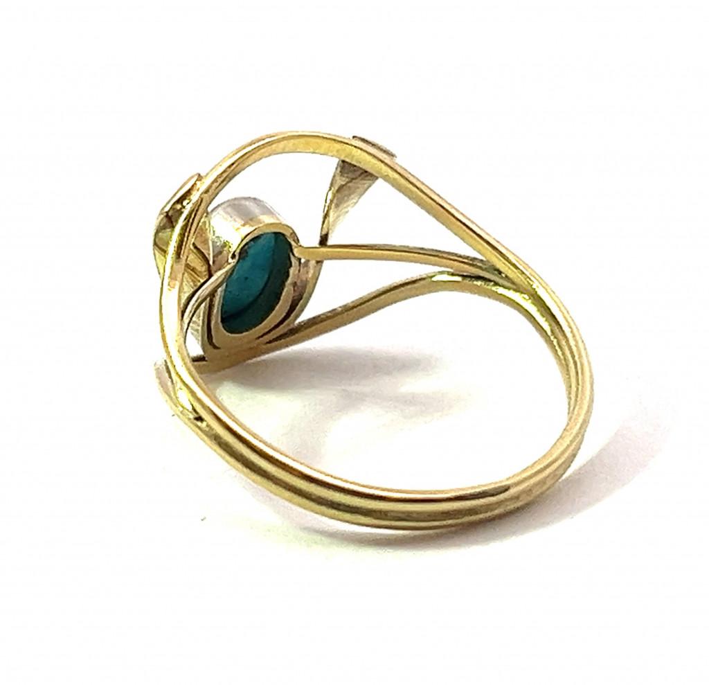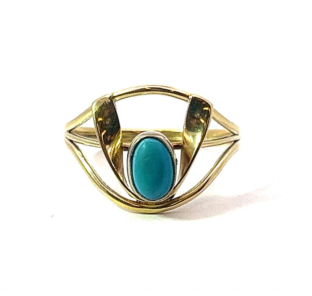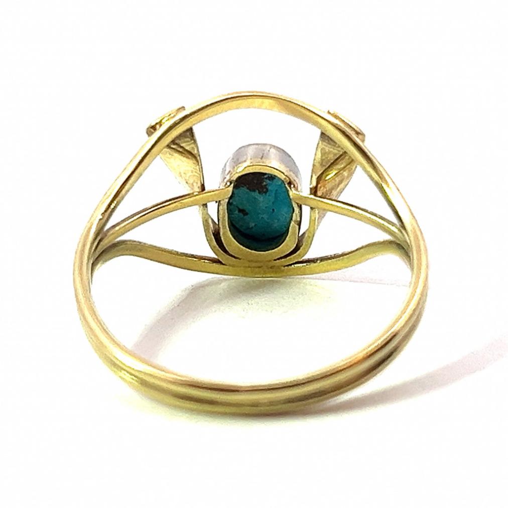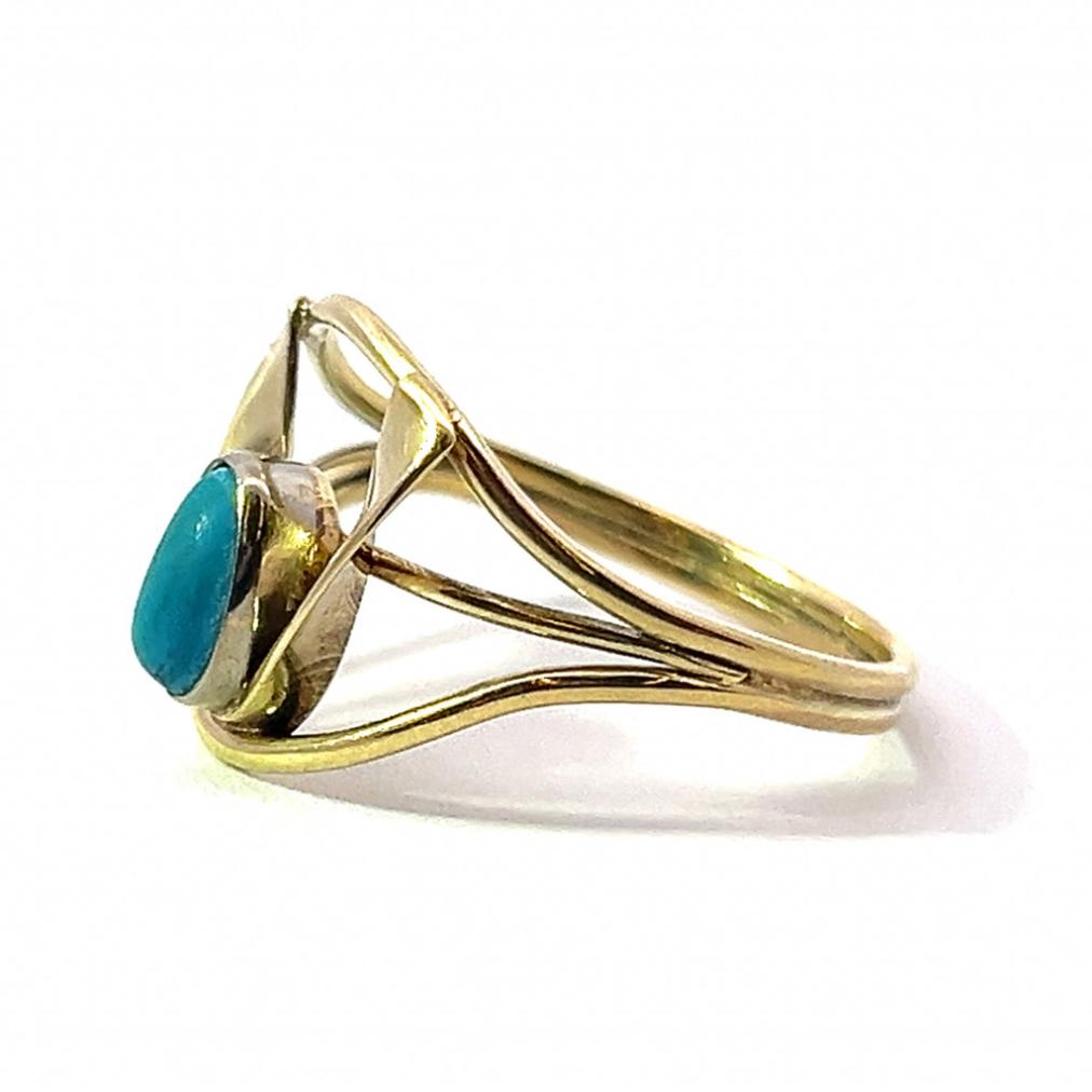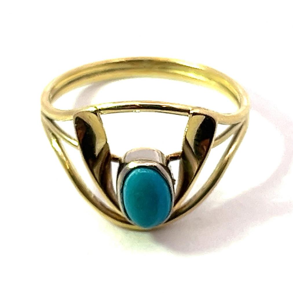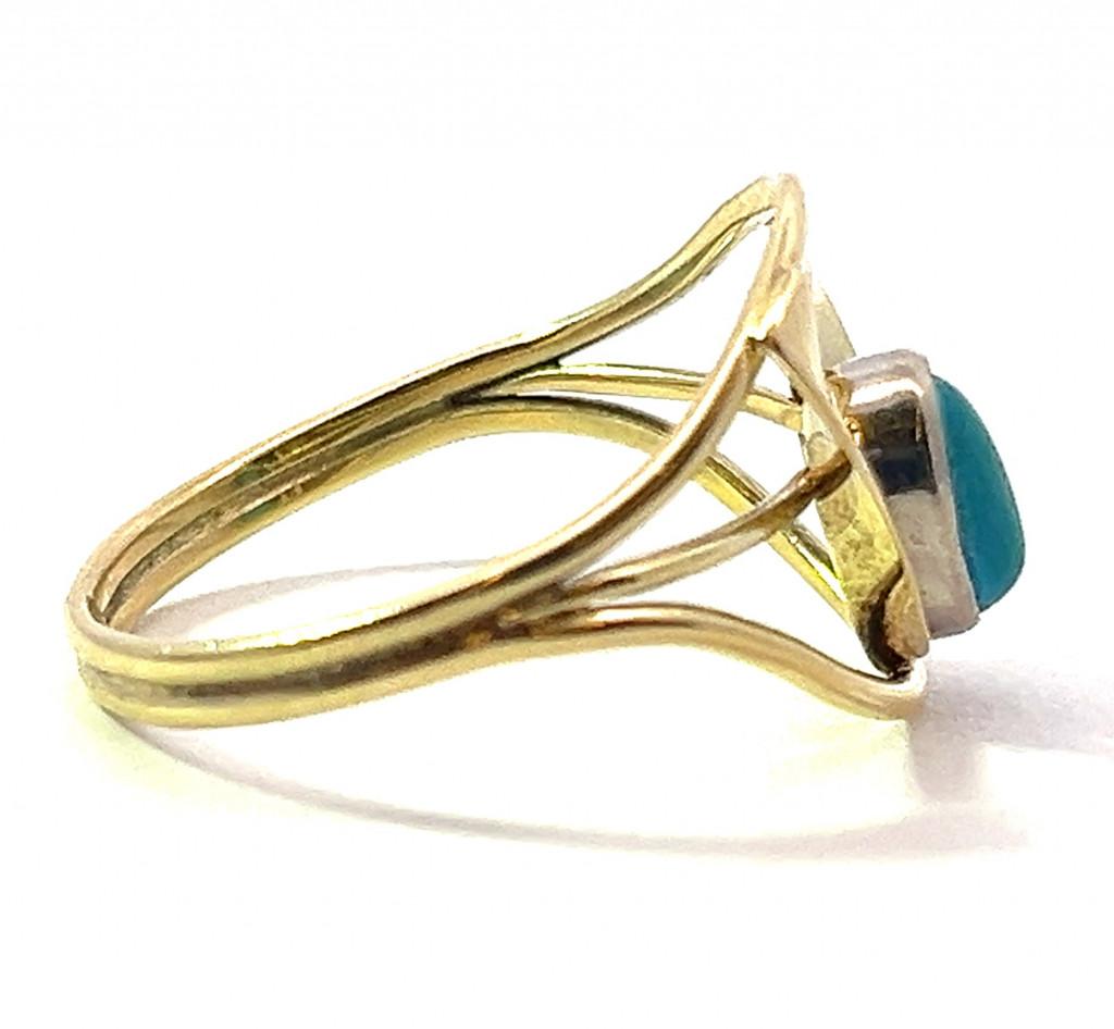 Zajímavý zlatý prsten o ryzosti 585/1000 s puncem labuť. Váha prstene 2,22 g, velikost 54. Rozměry hlavy prstenu 13 x 18 mm. Velikost tyrkysu 5 x 7 mm.