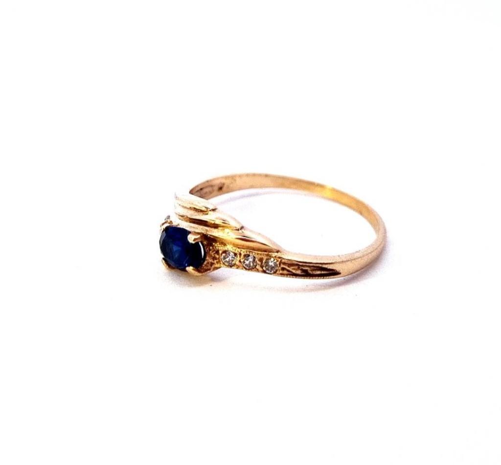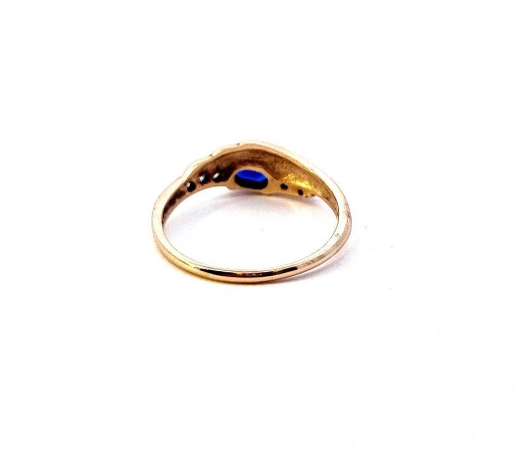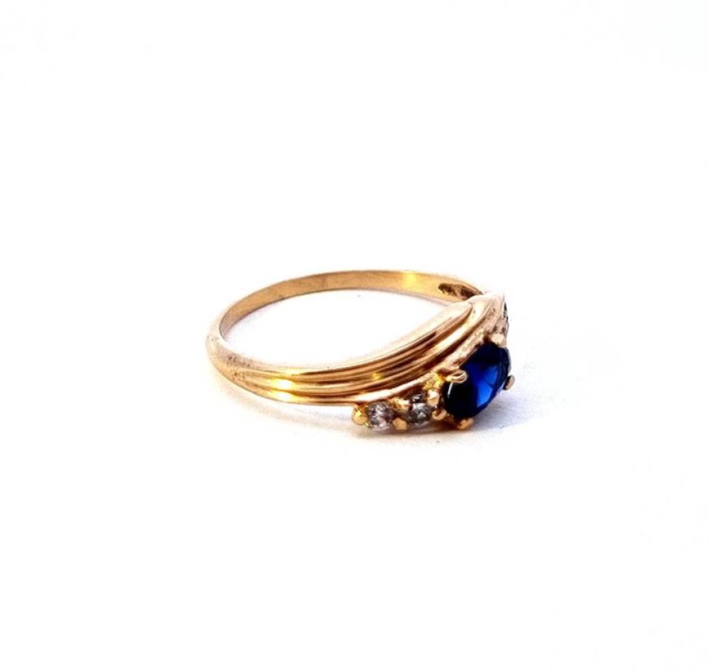 Zlatý prsten o ryzosti 585/1000, punc labuť. Velikost 56, váha 2,45 g, v nejširším bodě 7 mm. Kameny jsou syntetické.