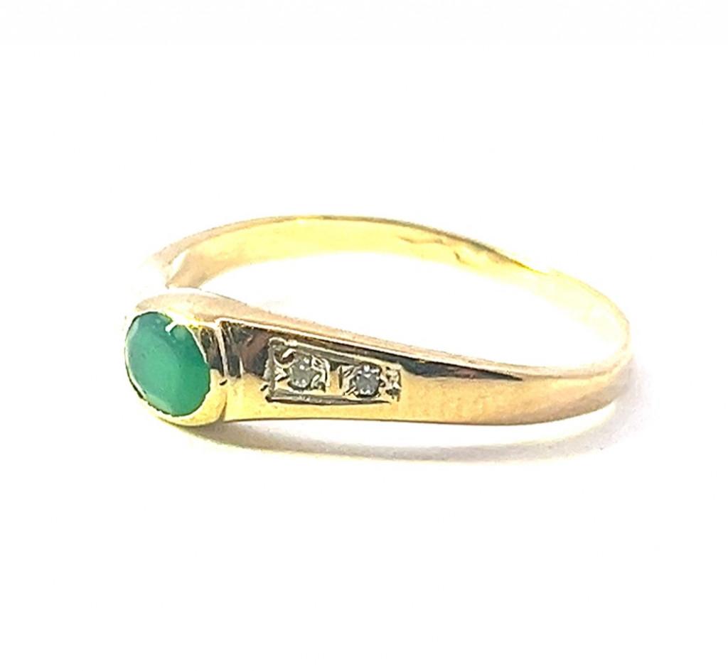 Jemný zlatý prsten se zeleným kamenem a zirkony o ryzosti 585/1000 s puncem labuť. Váha 2,04 g, velikost 55. V nejširším bodě 5 mm. Rozměry zeleného kamene jsou 4 x 5 mm. Kameny jsou syntetické.