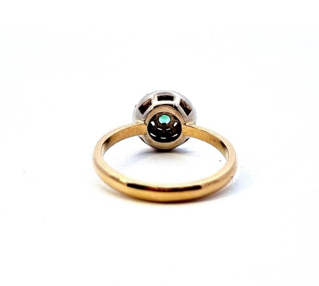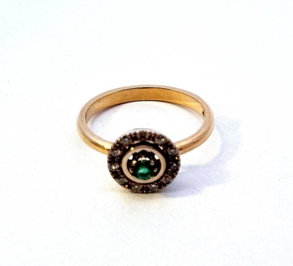 Zlatý prsten z bílého a žlutého zlata o ryzosti 585/1000, punc labuť. Velikost 54, váha 3,17 g, rozměr hlavy prstenu 10 x 10 mm. Kámen - přírodní smaragd, cca 0,10 ct. Kámen - přírodní diamant briliantového brusu - celkem 11 ks, cca 0,01 ct každý - dohromady cca 0,11 ct.