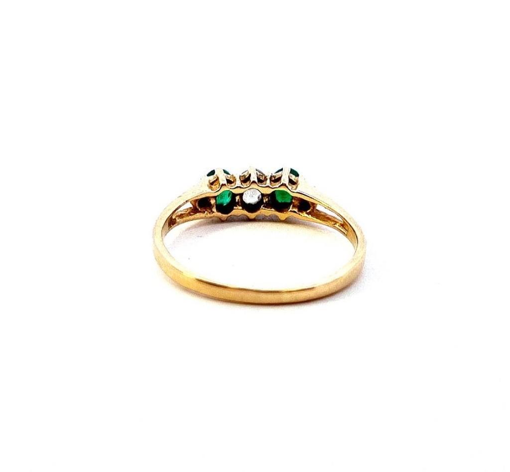 Zlatý prsten o ryzosti 585/1000, punc labuť. Velikost 54, váha 1,86 g, v nejširším bodě 5 mm. Kameny jsou syntetické.