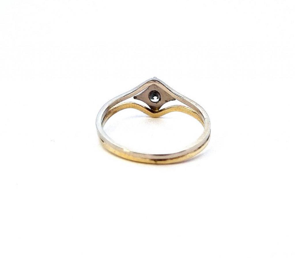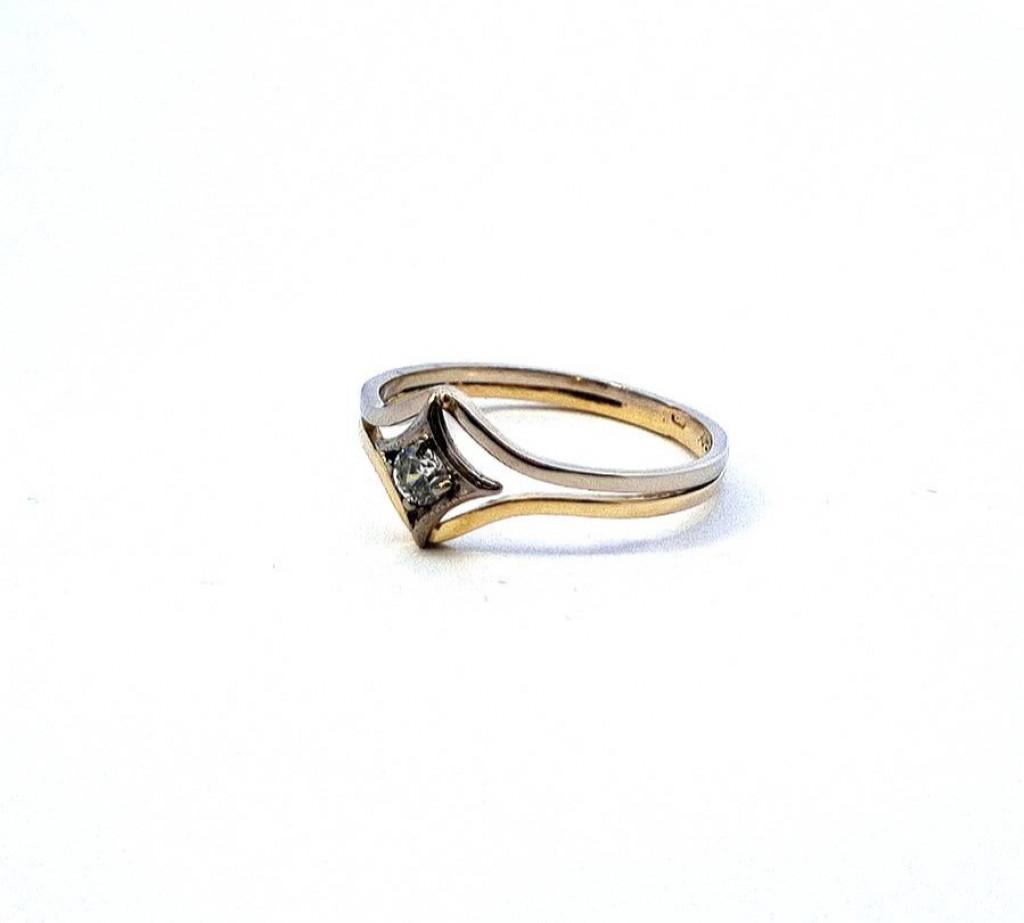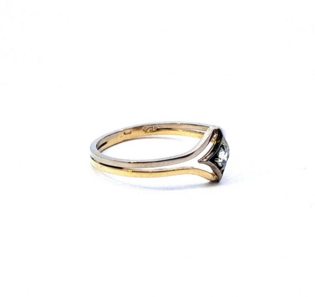 Prsten z kombinace žlutého a bílého zlata o ryzosti 585/1000, punc labuť. Velikost 54,5, váha 1,81 g, v nejširším bodě 8 mm, průměr kamene 3 mm.