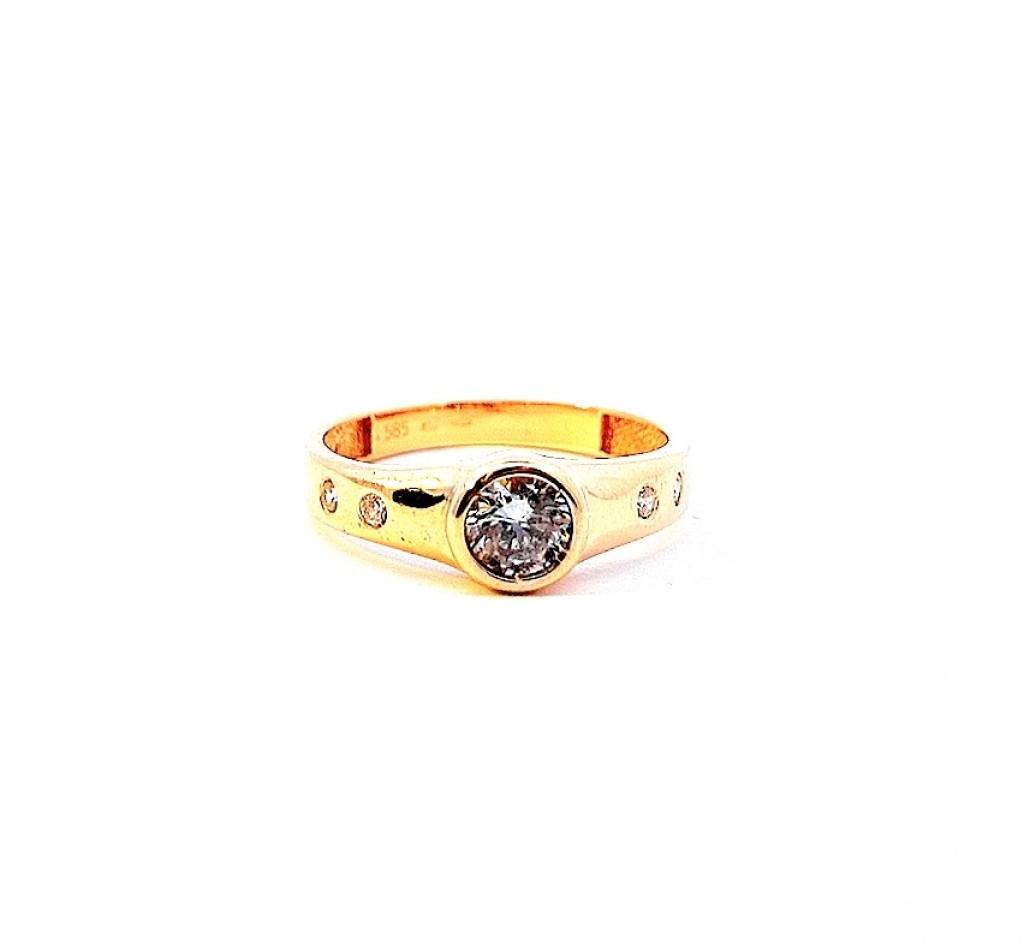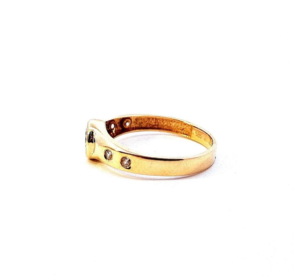 Zlatý prsten o ryzosti 585/1000, punc labuť , váha 2,06 g, velikost 56, v nejširším bodě 6 mm, průměr kamene - 5 mm.
