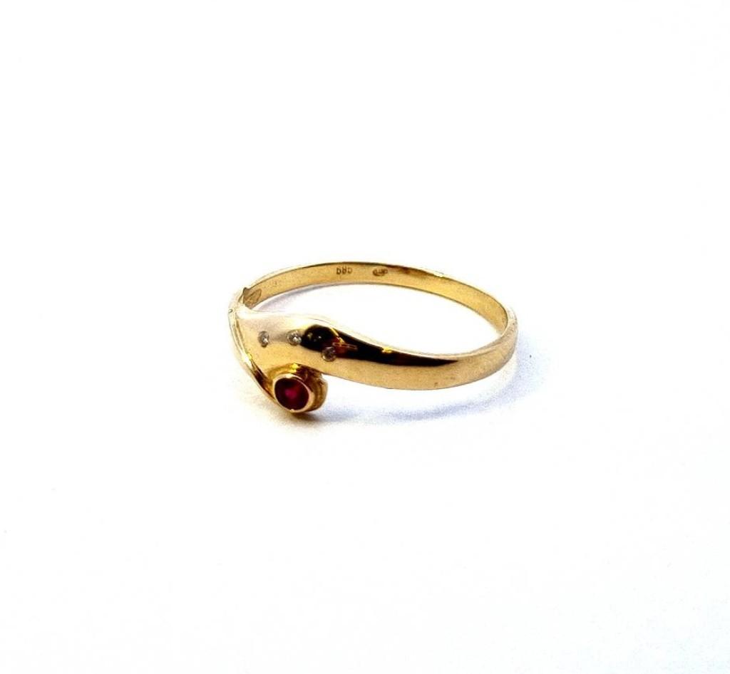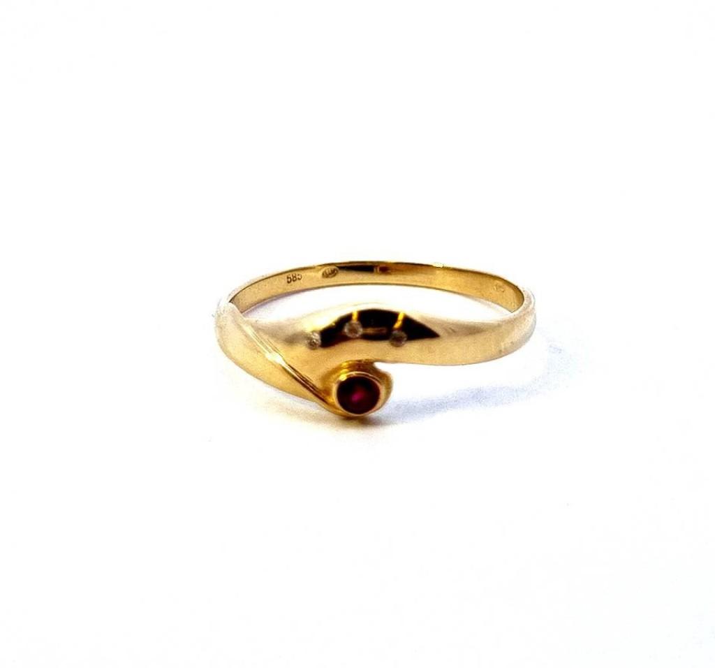 Zlatý prsten o ryzosti 585/1000, punc labuť. Velikost 57, váha 1,69 g, v nejširším bodě 7 mm. Kameny jsou syntetické.