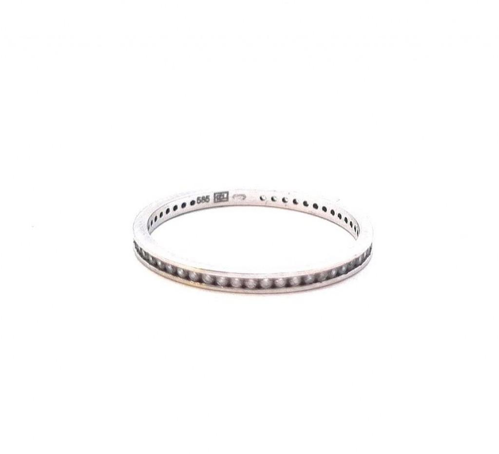 Prsten z bílého zlata o ryzosti 585/1000, punc labuť. Velikost 54, váha 1,14 g, v nejširším bodě 2 mm.