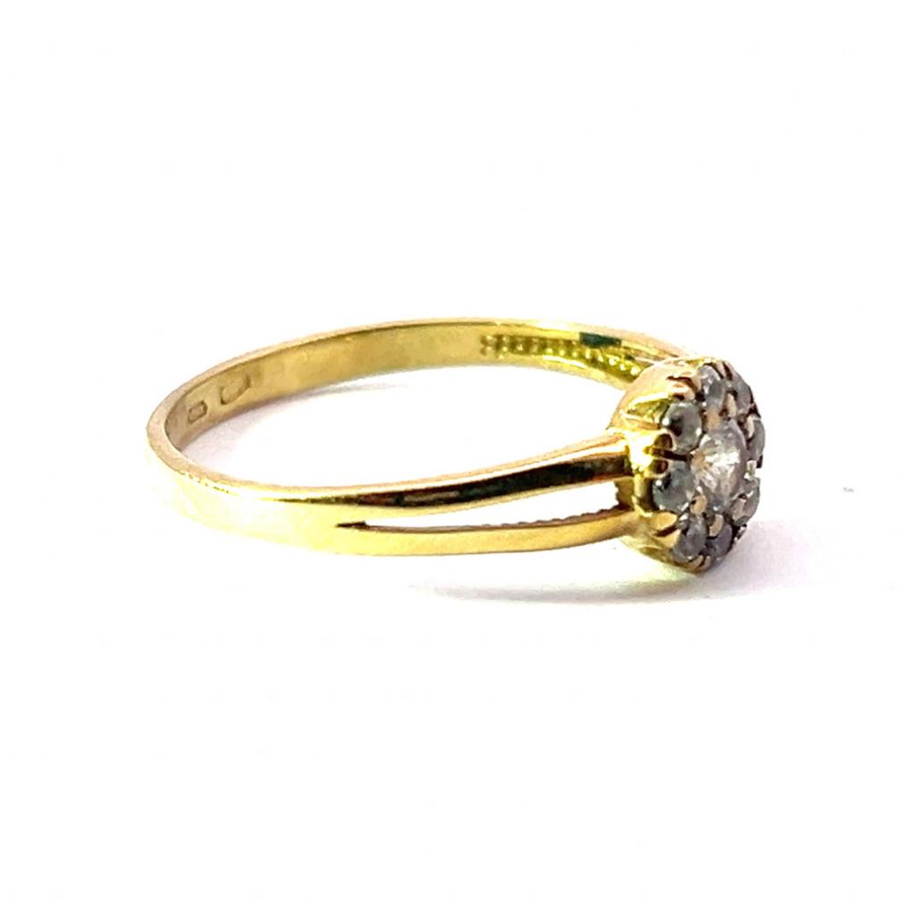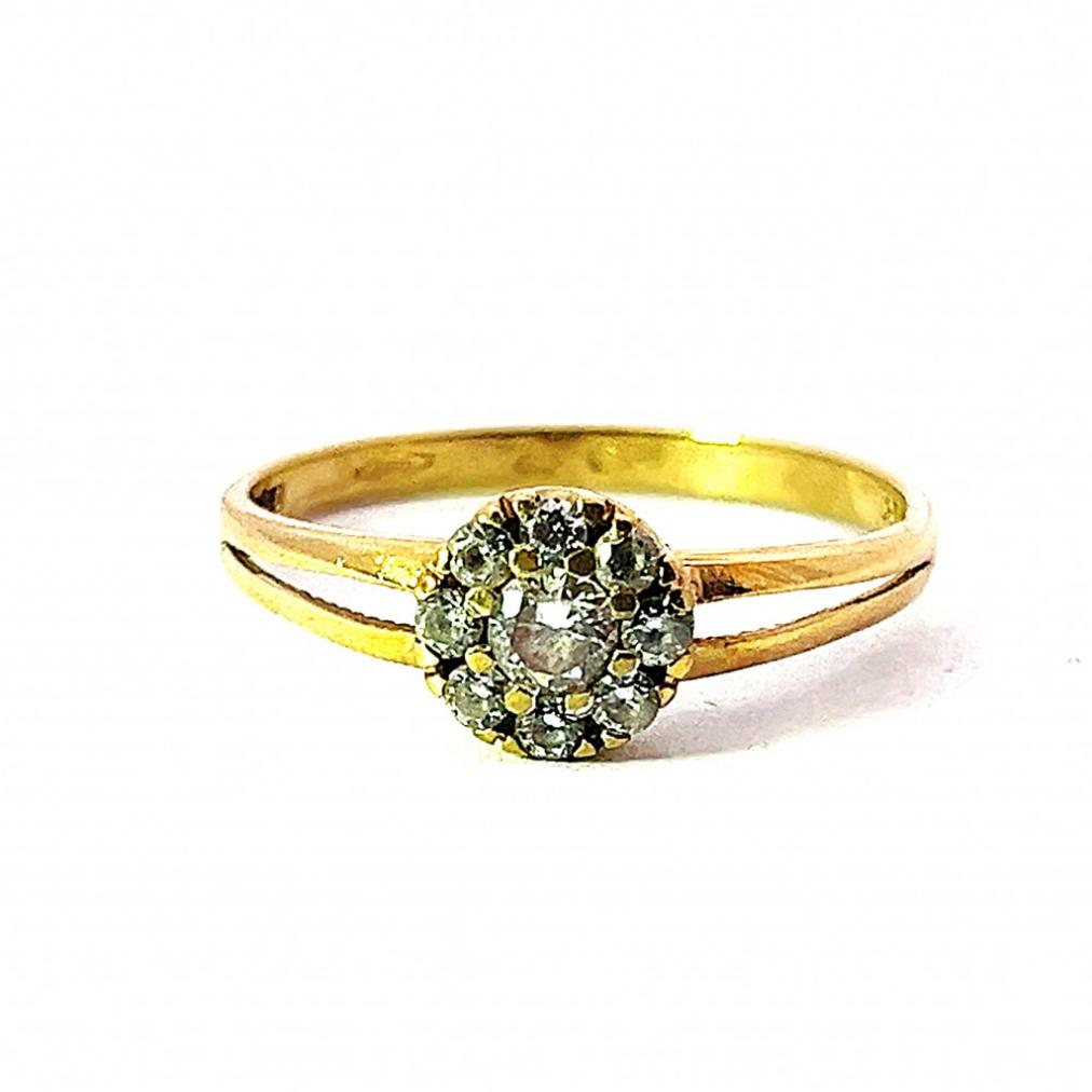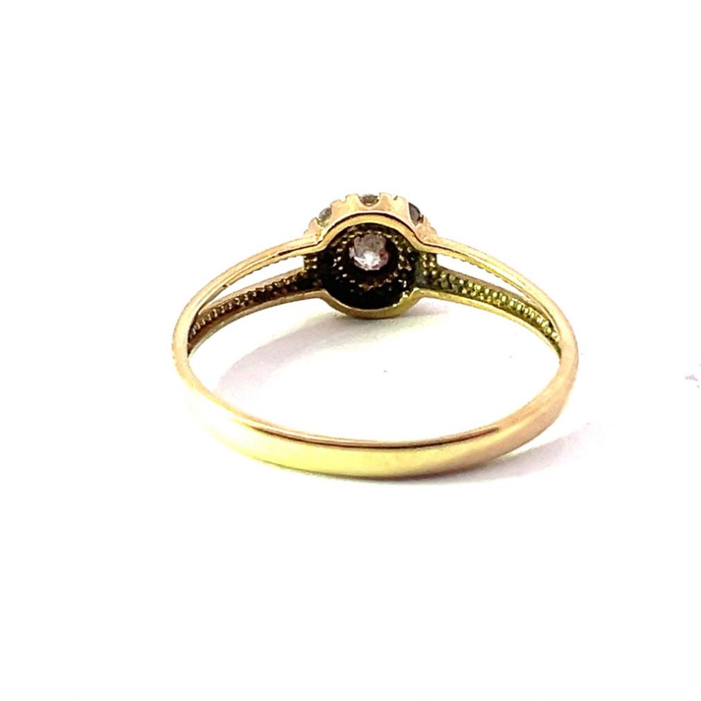 Zlatý prsten se zirkony do tvaru květiny. Zlato o ryzosti 585/1000 platný polský punc. Velikost 55, váha 1,56 g. Průměr hlavy prstenu 7 mm, průměr centrálního kamene jsou 3 mm. Kameny jsou syntetické.