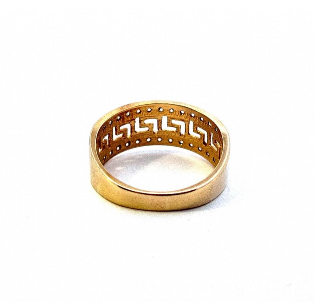 Zlatý prsten o ryzosti 585/1000, punc labuť. Velikost 57, váha 3,21 g, v nejširším bodě 8 mm.