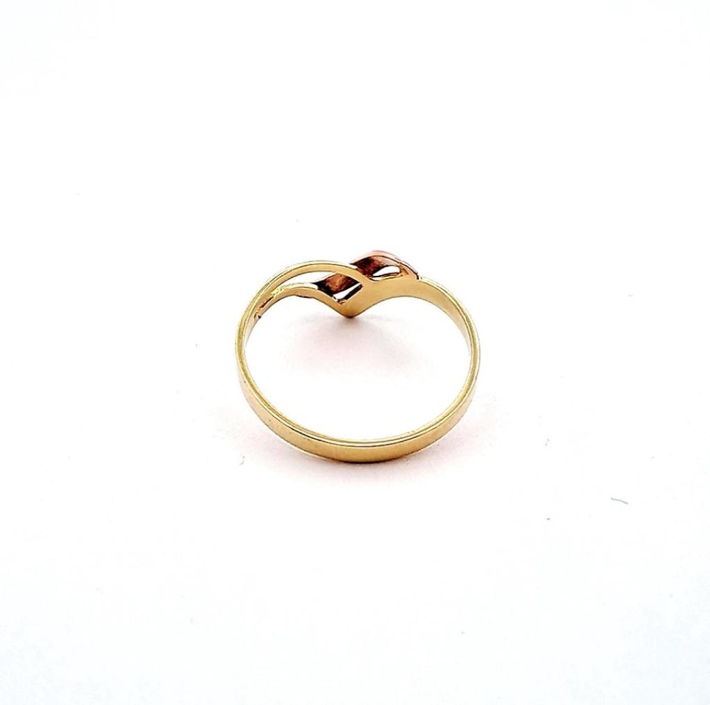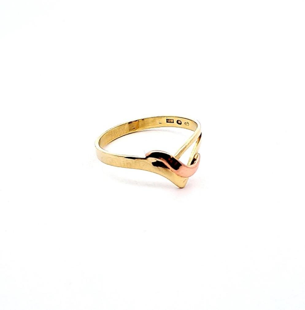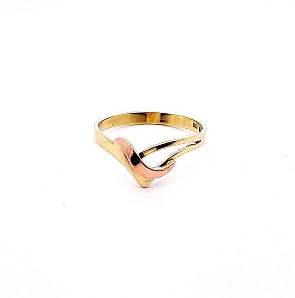Zlatý prsten, vel. 52, ryzost 585/1000, punc labuť. Váha 1,32 g, šířka v nejširším bodě 8 mm.