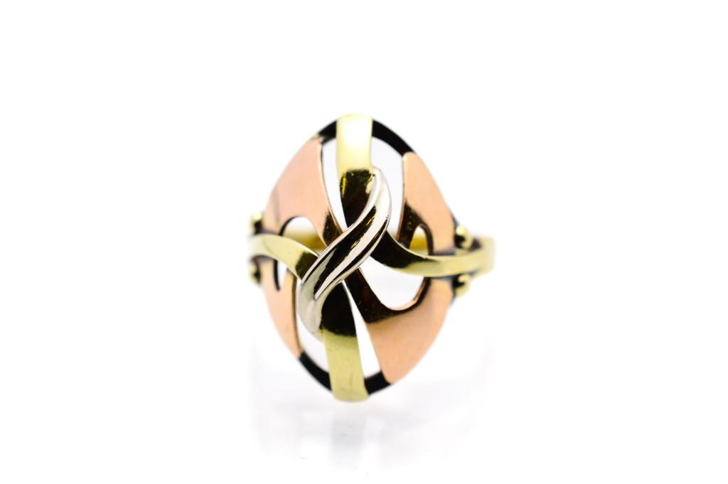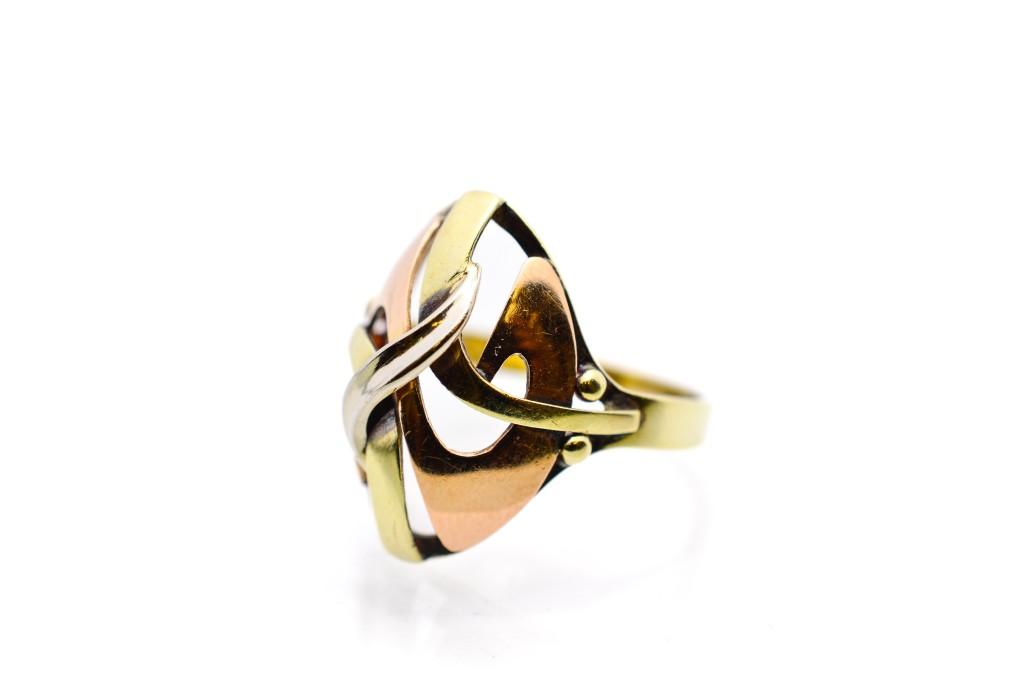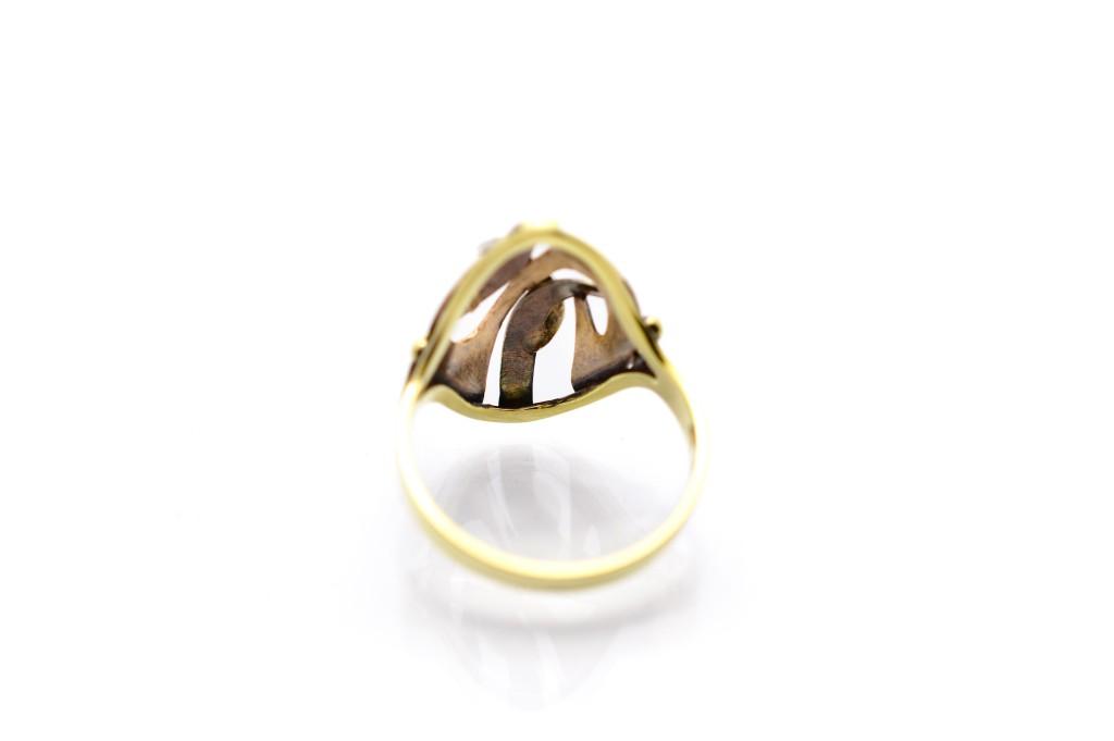 Zlatý prsten, vel. 55. Ryzost 585/1000, punc čejka. Váha 3,24 g, rozměry hlavy 20 x 15 mm.