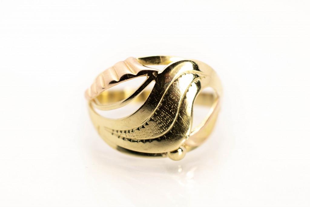 Zlatý prsten o ryzosti 585/1000, punc labuť, váha 2,89 g, velikost 55, v nejširší bodě 14 mm.