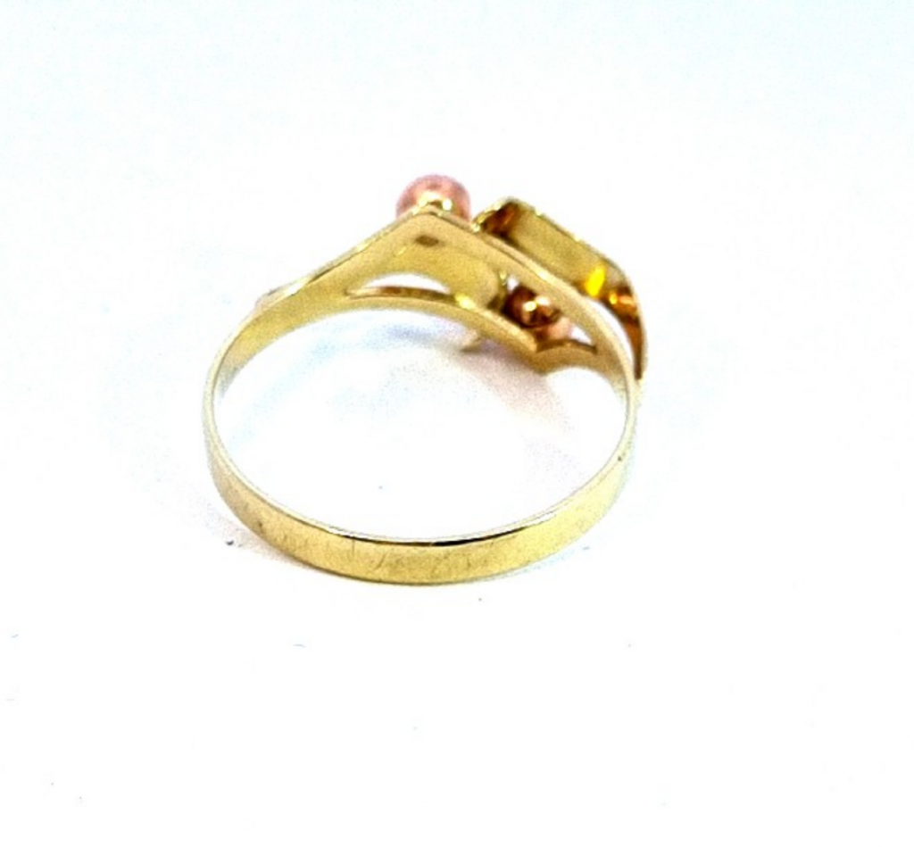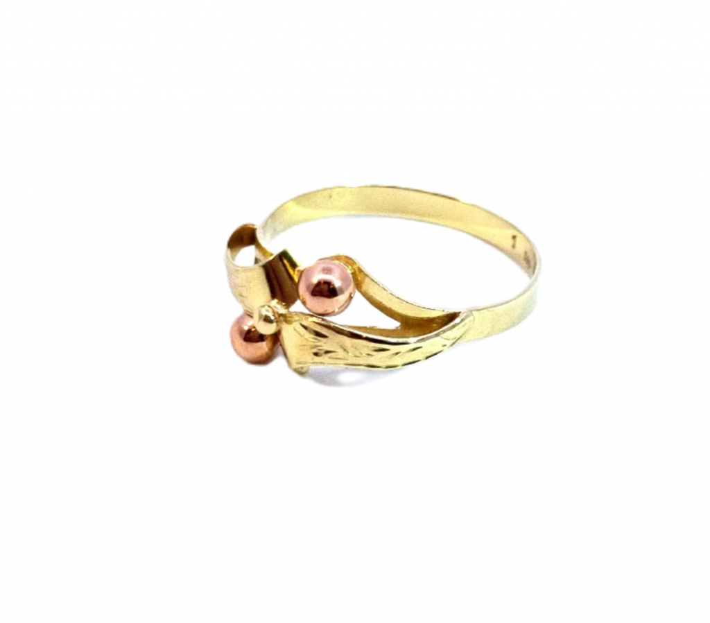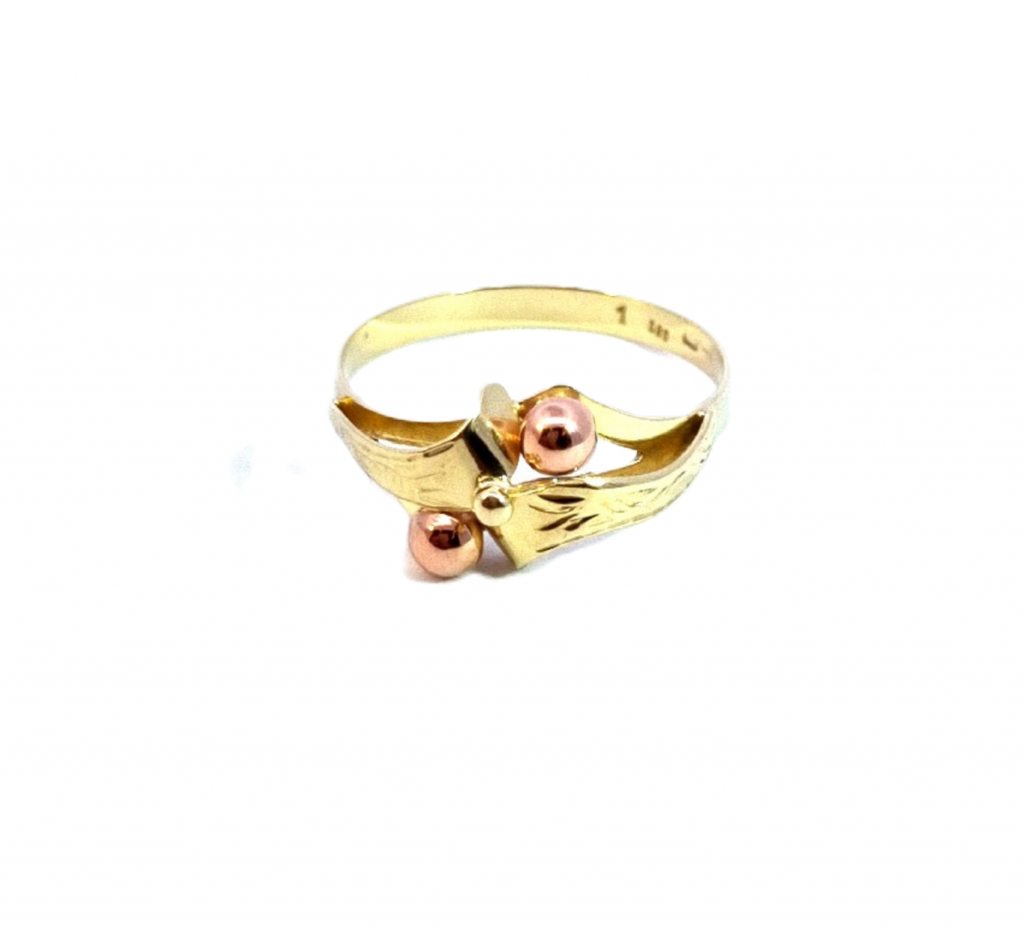 Prsten z kombinace žlutého a růžového zlata o ryzosti 585/1000, punc labuť. Velikost 57, váha 1,98 g, v nejširším bodě 9 mm, průměr kuliček 3,5 mm.
