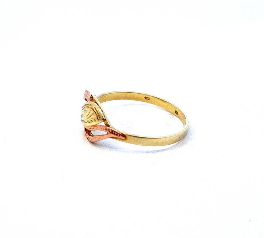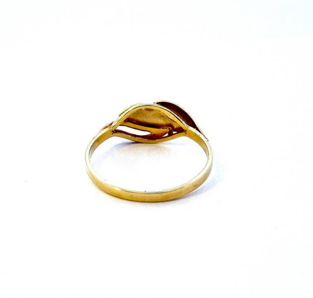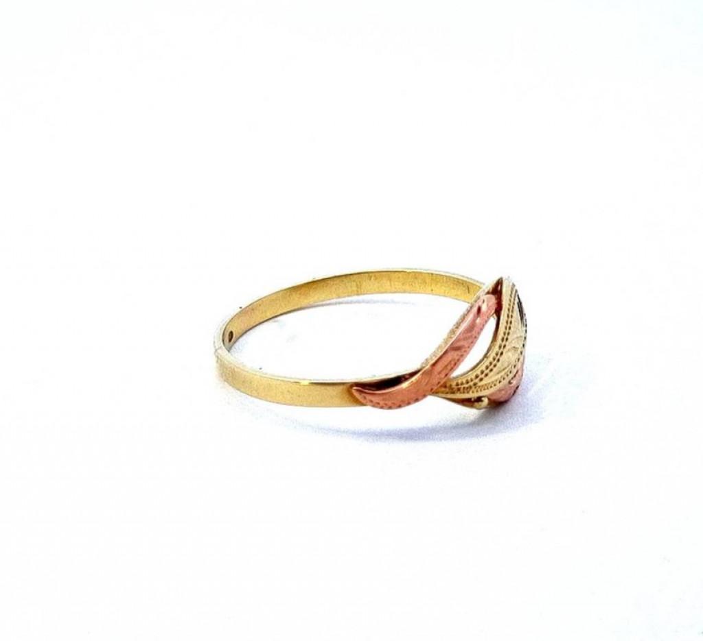 Prsten z kombinace žlutého a růžového zlata o ryzosti 585/1000, punc labuť. Velikost 61, váha 1,90 g, v nejširším bodě 8,5 mm.